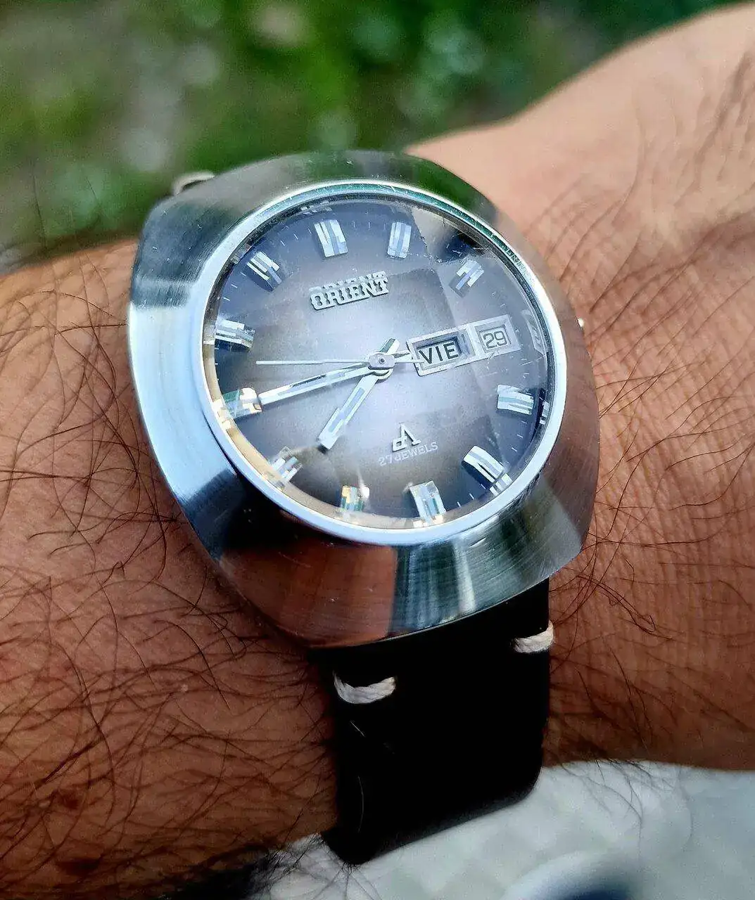El reloj de mi padre, un Orient con cristal facetado y automático con una bellísima esfera ámbar. También restaurado por Ancora, recuerdo pasar las horas embobado mirando y remirando este reloj y escuchando su sonido tic-tac: