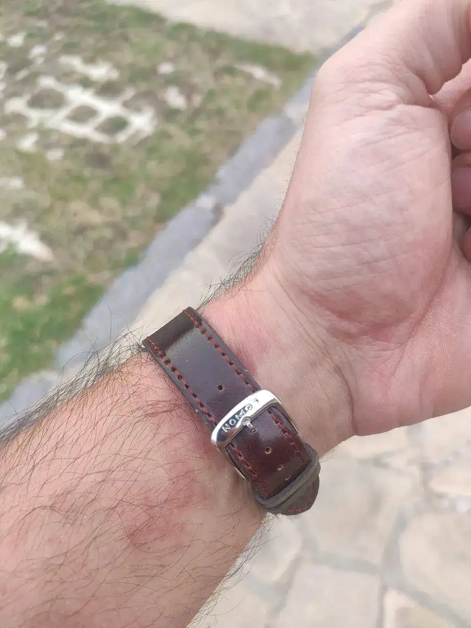 Tiene una pinta increíble y al Seiko le queda genial.Pongo unas fotos de la correa recién puesta, solo puedo recomendarla.