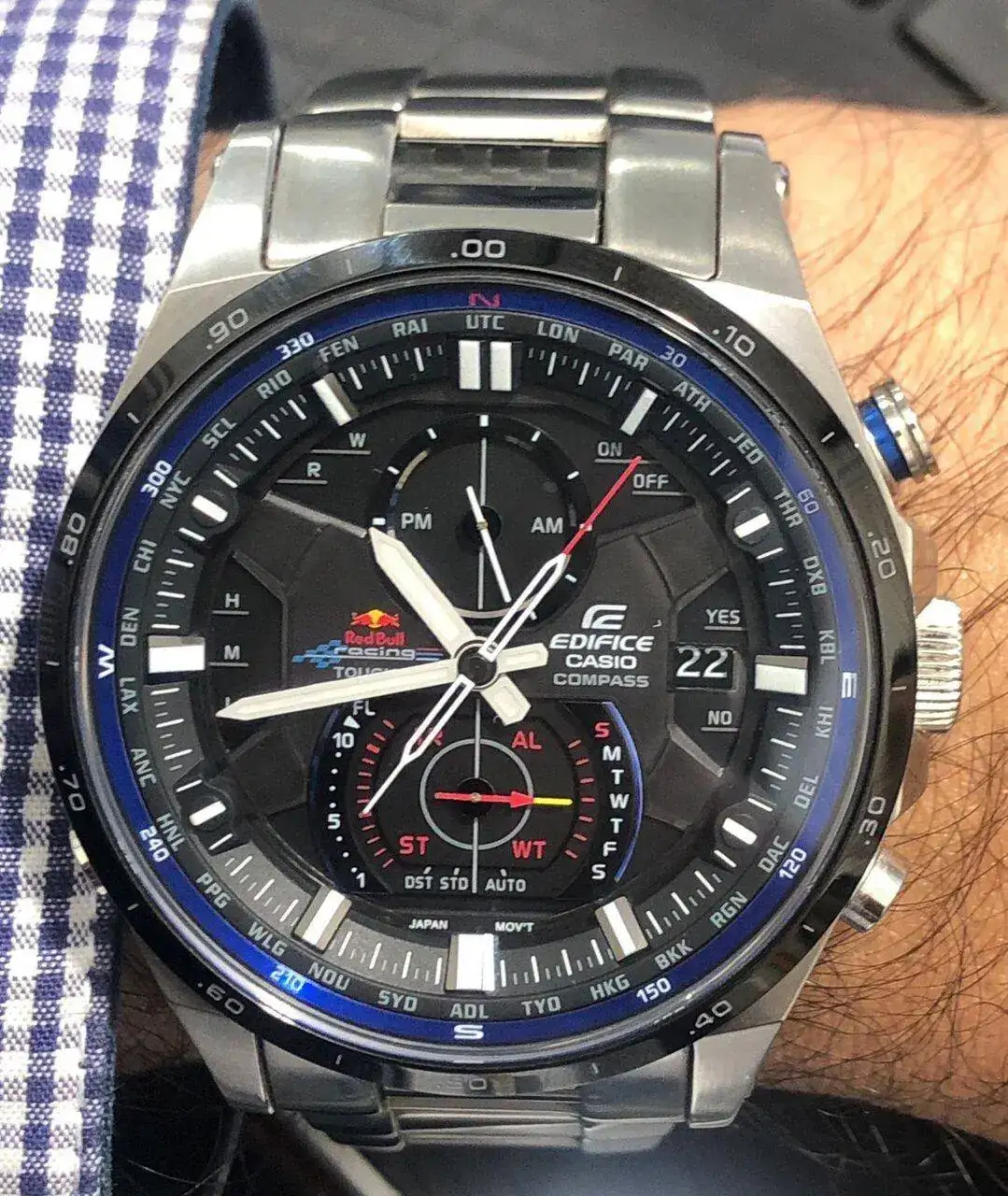 Con esta maravilla se puede viajar al espacio o manejar un Formula 1 a toda velocidad, tiene un gel interiormente que evita las vibraciones y pasadores de fibra de carbono además de ser radio controlado, solar, sumergible hasta 100 metros, con brújula, hora mundial, cronógrafo, cuenta regresiva, registro de vuelta más rápida, alarma, etc., etc.