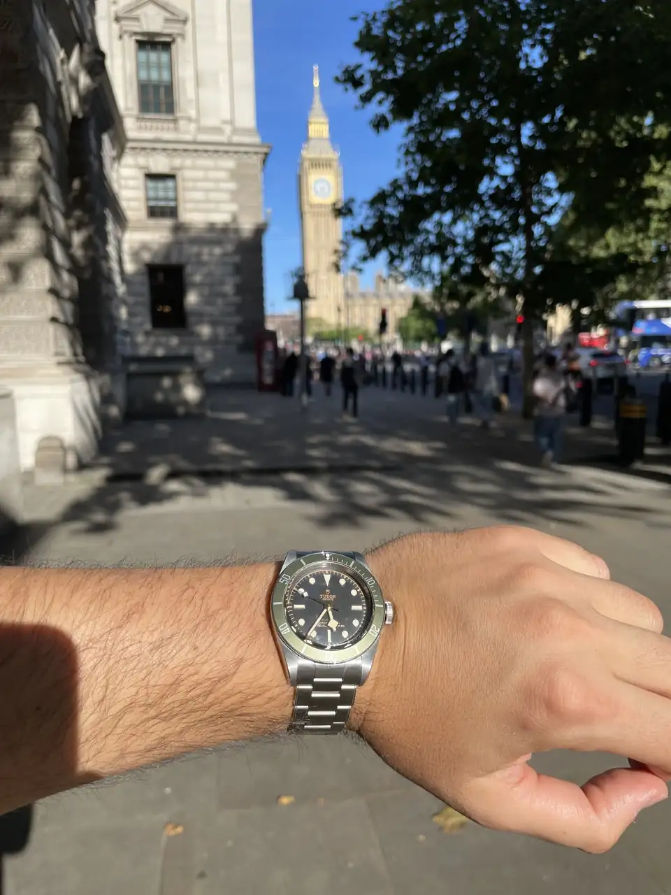 Hace unas semanas, asumiendo que el Sub era un imposible (la supuesta lista en la que apuntaron a mi amigo debía de tener más agujeros que un Emmental y nuevamente mi orgullo me impedía acudir al mercado gris) y estando a casi 6 meses de mis 40 primaveras (que evidentemente pensaba festejar con un reloj como regalo) empecé a buscar alternativas, siendo el Tudor BB el que más papeletas tenía. A principios de este mes de agosto nos hemos ido de vacaciones a Londres y una necesidad que tenía era ver en vivo el BB Harrods (en fotos es un reloj que siempre me ha encantado, pero ya sabemos que de la foto a la muñeca puede haber un mundo...). Así que allá que nos fuimos mi mujer, los peques y yo. Y nada más verlo me quedé prendado. Inicialmente no tenía intención de comprarlo (actualmente se puede conseguir online en la web de Harrods y me daba cosa optar por ese modelo 'en caliente' habiendo salido el nuevo BB con algunas mejoras y sin valorar bien ambas opciones), pero mi mujer, que no me la merezco, no me dejó salir de la tienda sin él (y le estaré por siempre agradecido ya que me parece un reloj maravilloso). Dejo por aquí una foto pero a ver si le hago una presentación como se merece, ya que el reloj me parece una pasada (además de original). De hecho, creo que en muchos aspectos no le tiene nada que envidiar al prota del hilo 😉.