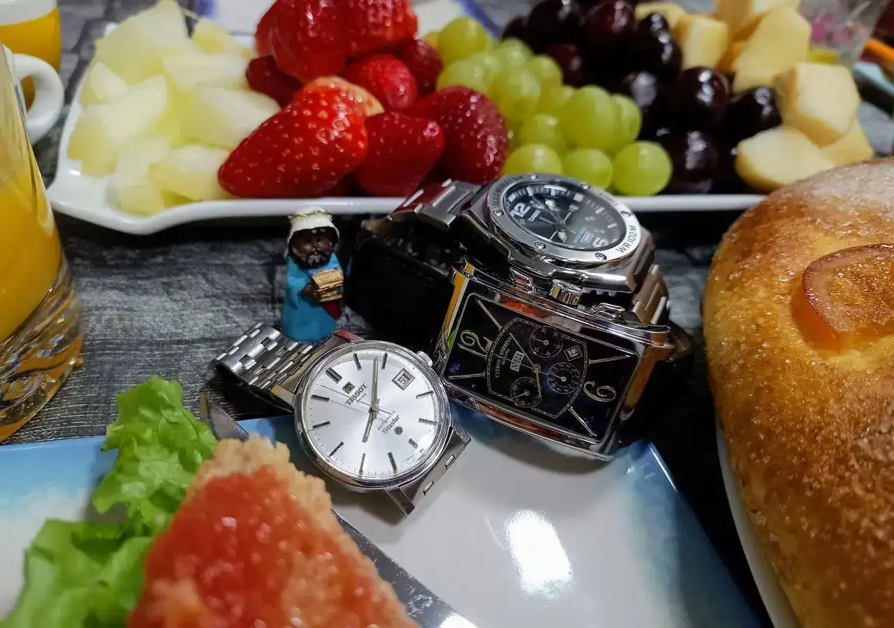 😋😋 No sé si me gustan más esos relojes o las viandas que se intuyen. Ya me apuntaba yo a un desayuno de esos...
