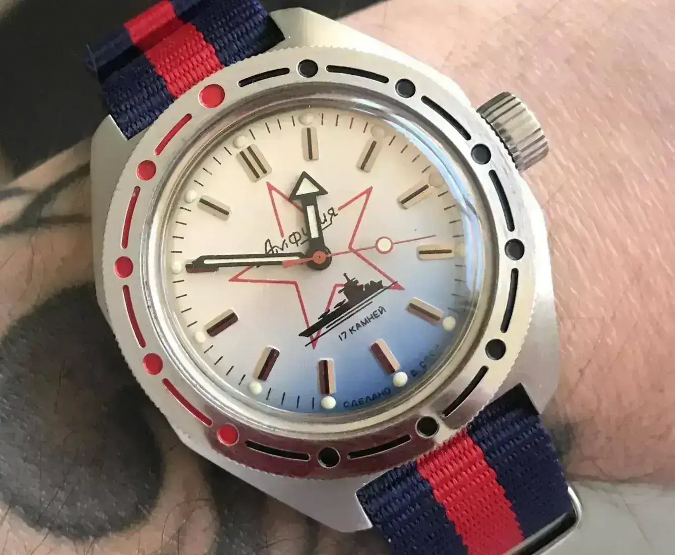 Se debe a que es un dial de finales de la urss principios de la actual RusiaYo tengo una pregunta, adopte este vostok por eBay pero me he fijado que no tiene letras abajo como la de otros compañeros.