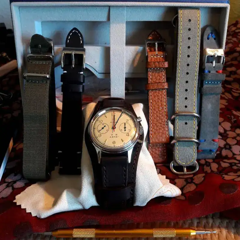 , que dos que trae de dotación, más la tipo suede que ya llegó, más la bund, más la marroncita de piel y la zulú en canvas... creo que es el reloj con más fondo de armario de todos los que tengo... y me quedan por aguantar 20 días más... voy a ir mirando milanesas.