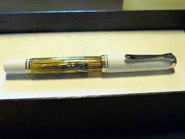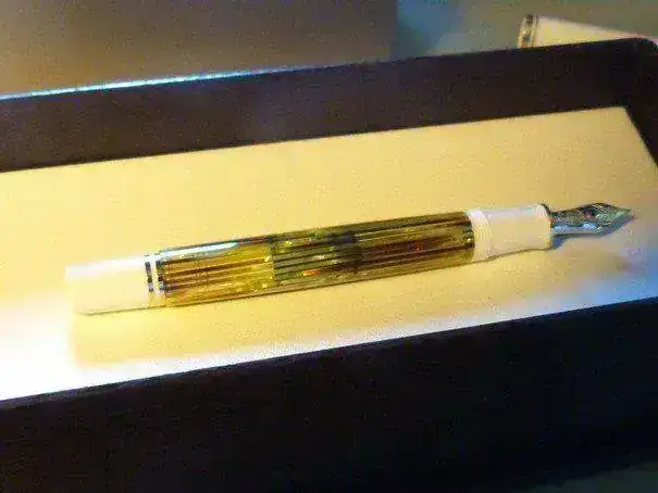 La pluma está hecha en acetato de celulosa. Es una Souverän M400, de punto fino, con el plumín bicolor de oro de 14 Klt. La carga por émbolo, por supuesto. El barril, al ser medio traslúcido, deja ver la carga de tinta que queda.