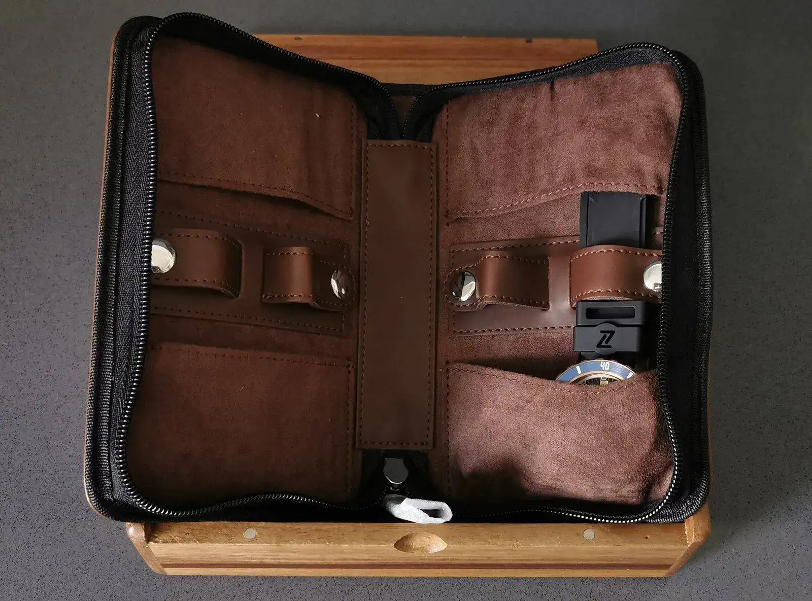 Otro buen detalle, estuchito de "cuero" para transportar 4 relojes. Me gusta me gusta...