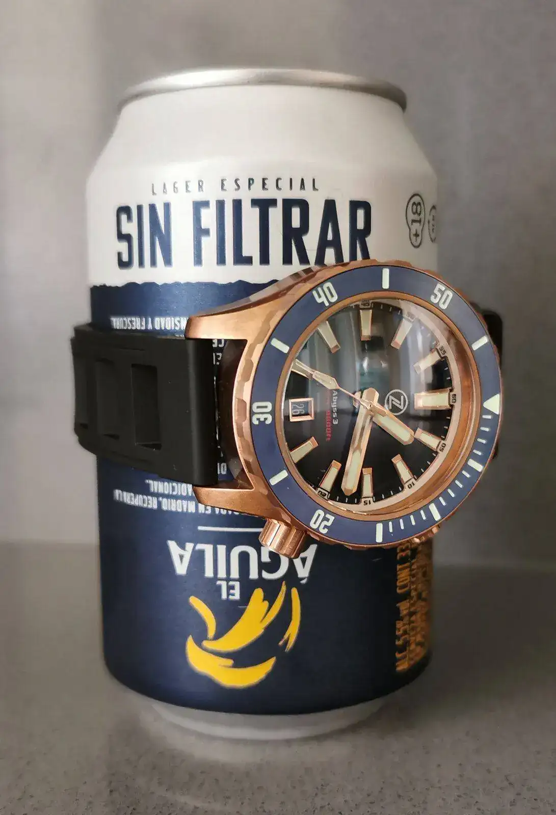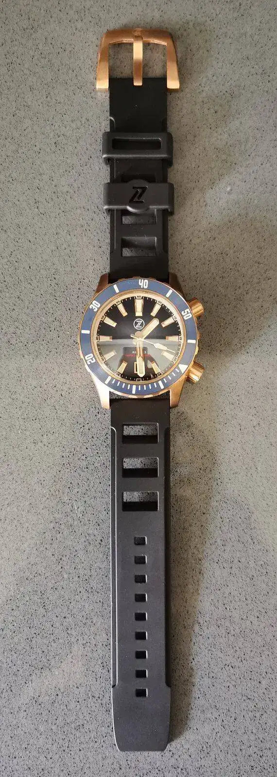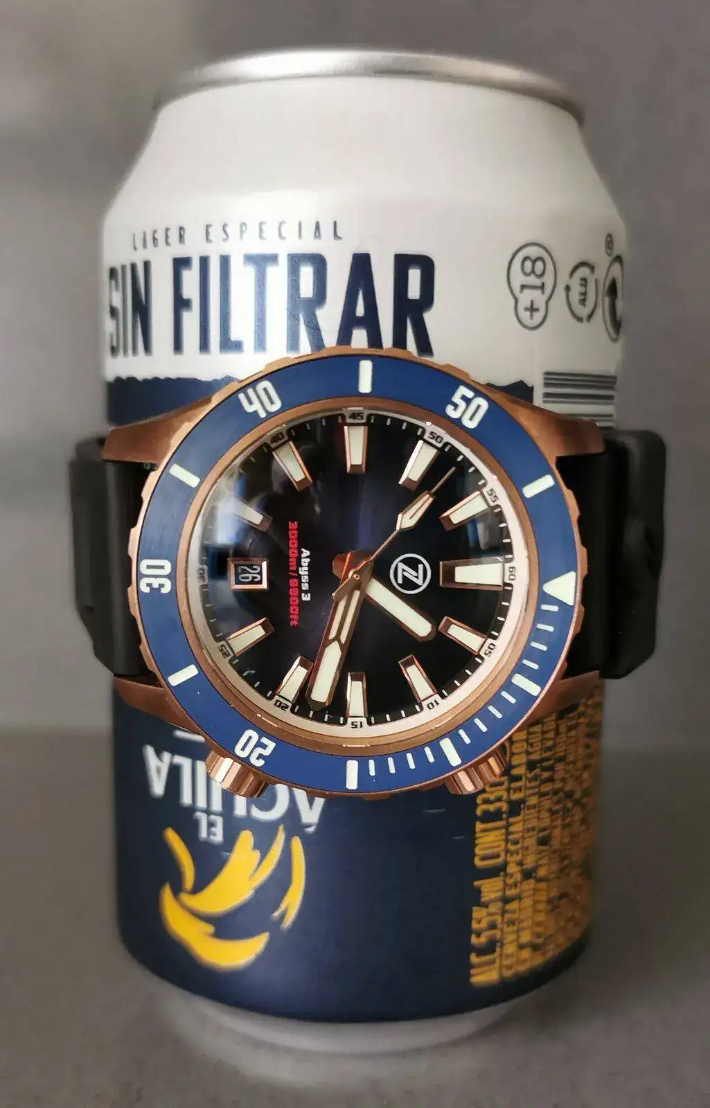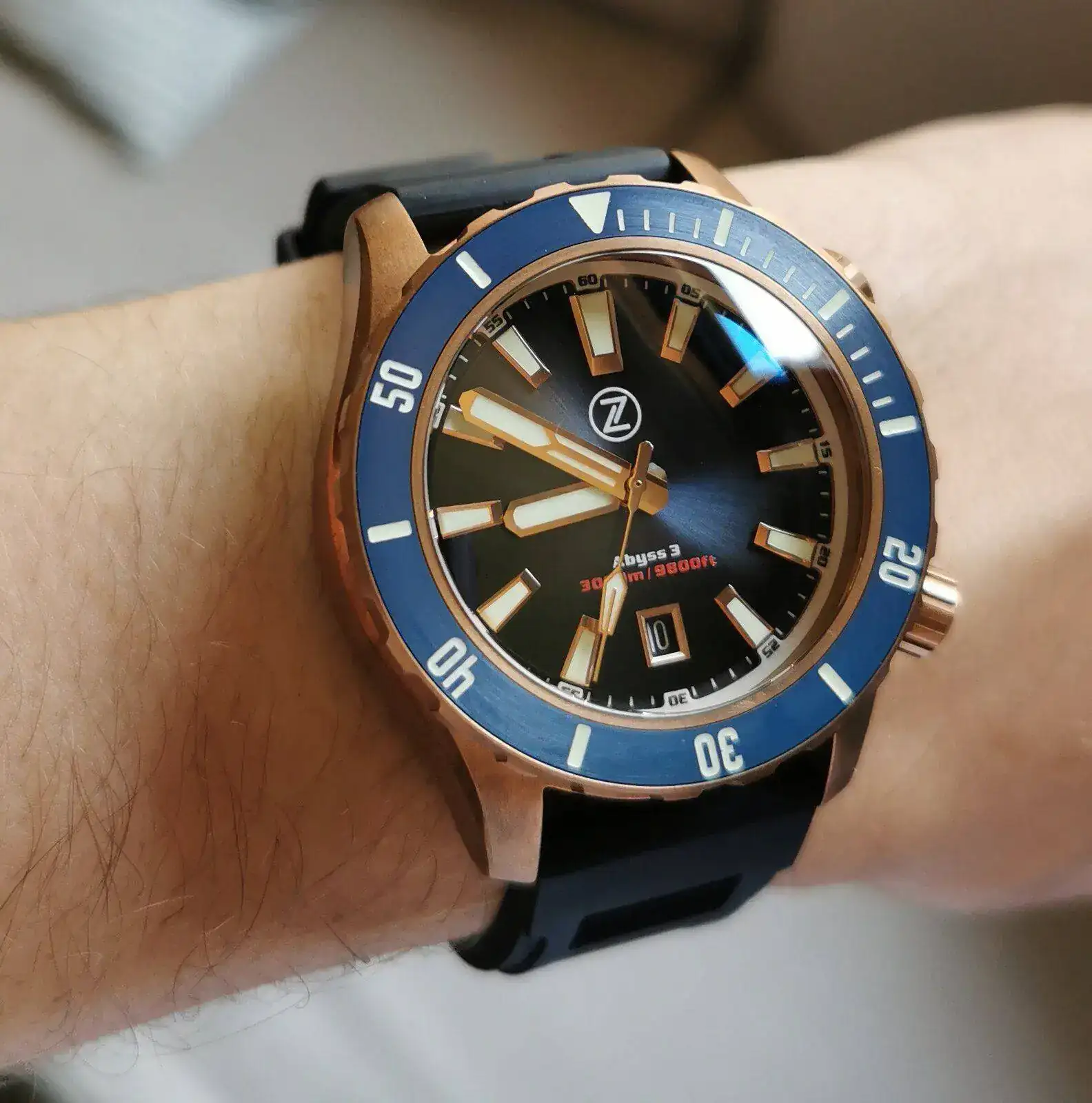 Como la paciencia nunca ha sido mi fuerte, el viernes pasado a las 5 de la mañana dando vueltas por casa con el niño en la mochila portabebés móvil en mano, me calenté y le di al botón de comprar de un Zelos Abyss 3 en azul y bronce en la página web de Teddy Baldassarre. No tengo mucha muñeca, 16.5, y el reloj es enorme y sobre todo muy, muy grueso... Pero me moló mucho el rollo pasado de vueltas total de los 3000 metros de profundidad (IMPRESCINDIBLE para las 3 veces al año que me meto a una piscina, y la vez cada 3 años que me baño en el mar) y los 20mm de grosor, aparte de que el reloj en si me parecía guapísimo, una pasada.