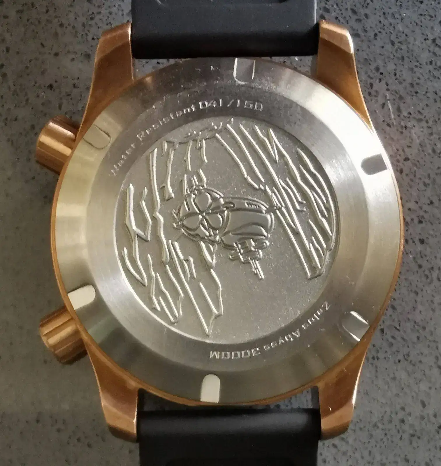 Relieve de submarino abisal en la tapa de Inox trasera, y el número de la tirada.