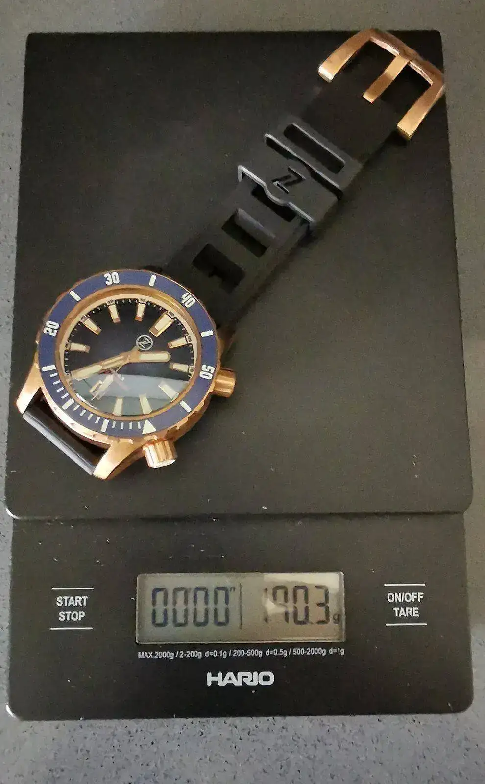 200 gramazos de reloj con la correa de goma. Y aún asi, está claro que en la muñeca se nota, pero me parece incluso cómodo! A mi me gustan los relojes muy muy ligeros, que ni sepas que están ahí, o con mucho peso, que sepas que llevas algo. Las pesos medios es donde no me acabo de encontrar a gusto.
