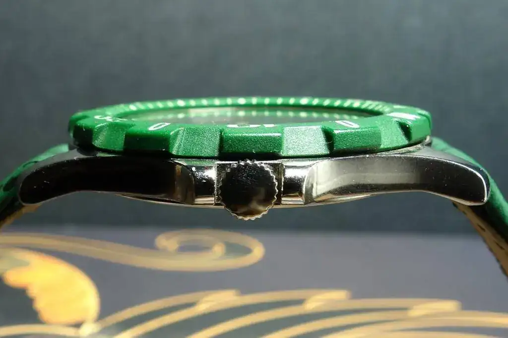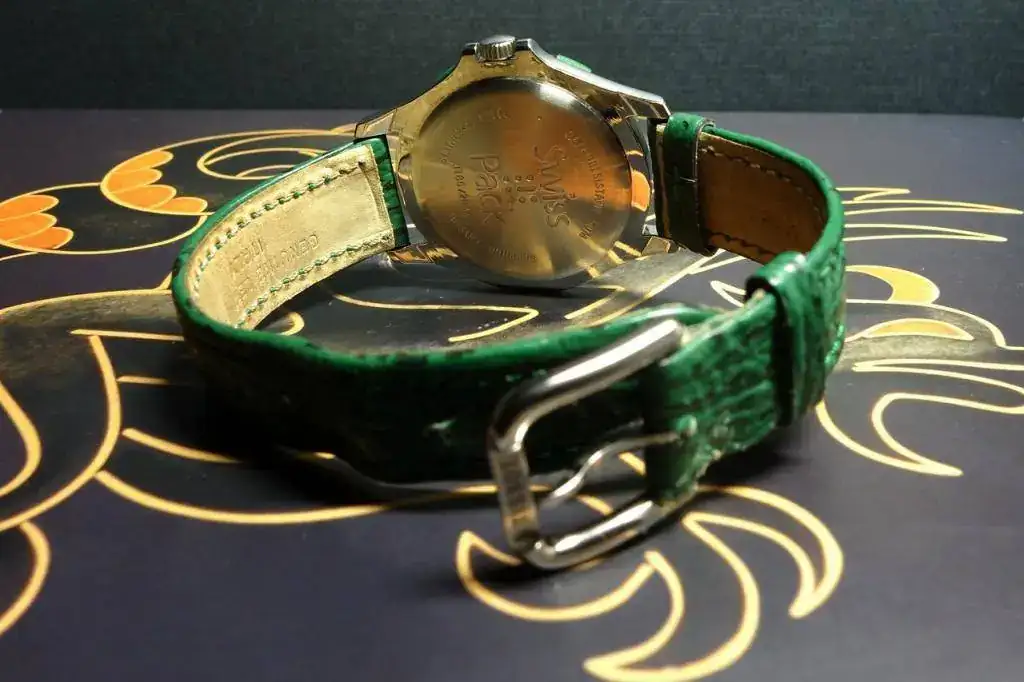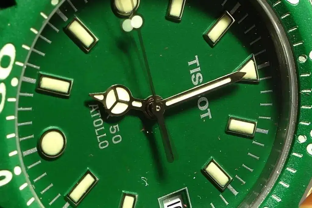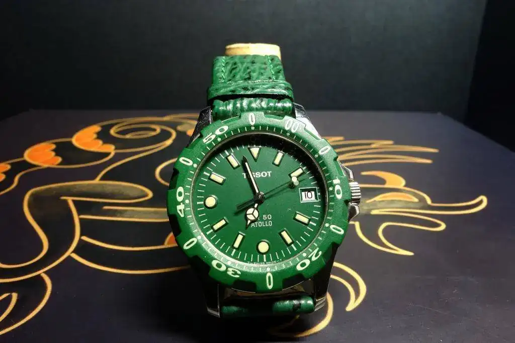 Empiezo por uno de los que habían sido descartados, un, Atollo 50 diver resistente a 50 metros sin corona roscada. Extraplano. No sé qué calibre monta. Tampoco sé mucho -ni nada- de las inscripciones en el fondo. Pero ese verde enamora, y el bisel de plástico (unidireccional) está impoluto.