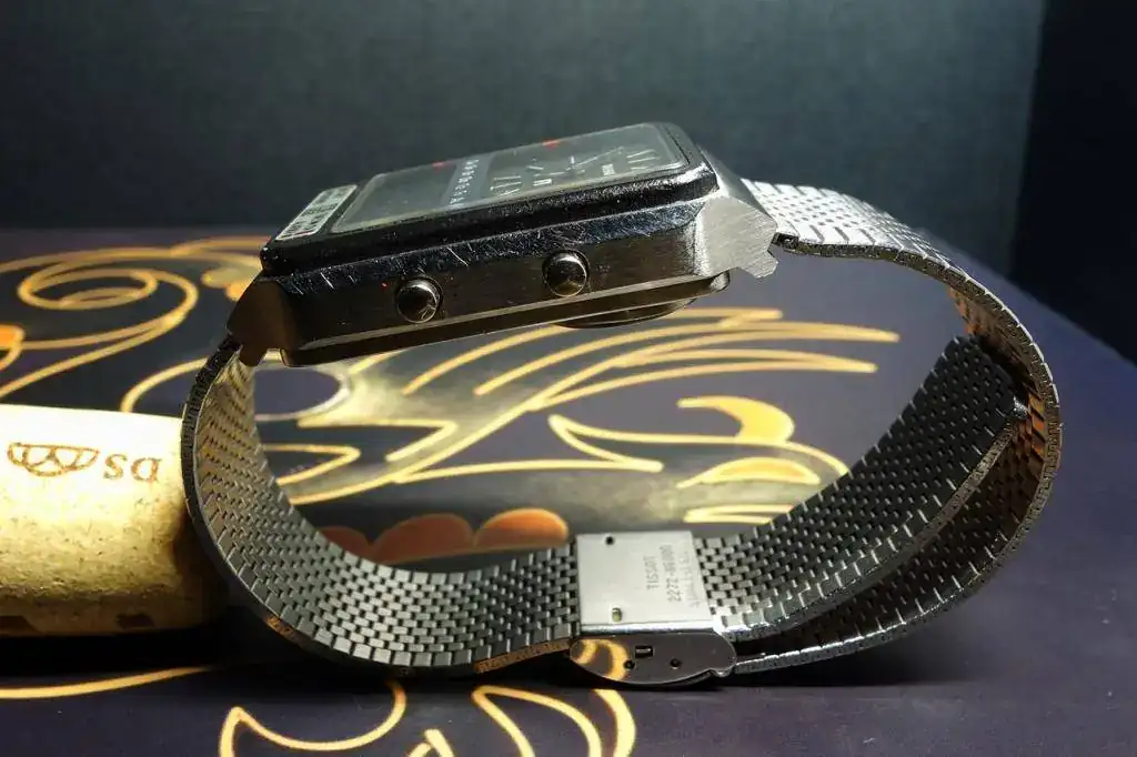 Este no tiene cuatro sino dos, y no son botones sino coronas. El Sonorous de la extensísisma familia PR 516 tiene en su esfera un color azul que le queda muy bien y que contrasta con la pequeña flecha roja que marca la hora del grillo, que suena en la máquina AS que al parecer montaban la mayoría de grillos de la época.