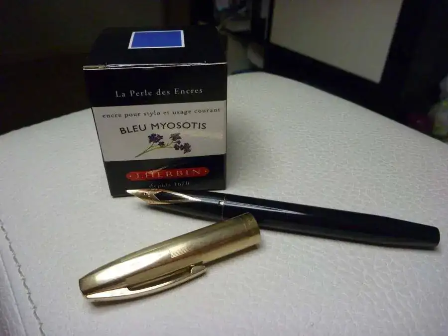 Para presentarosla y como su primera tinta despues de muchos años he elegido una J.Herbing de color Bleu Myosotis. En el muestrario de la tienda parecia turquesa aunque la verdad es que al utilizarla se queda en un azul un tanto normal..