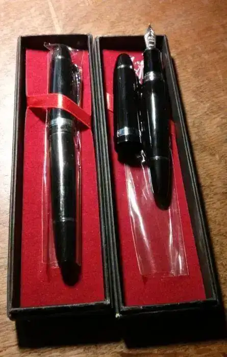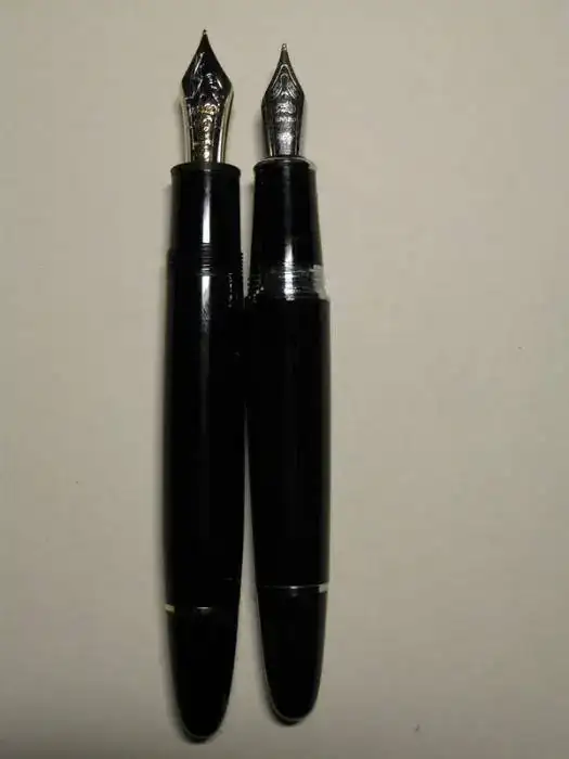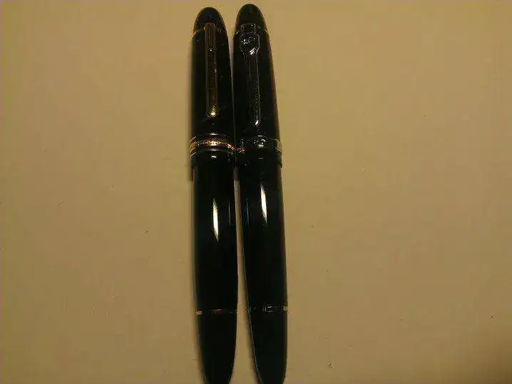 Hola: Yo tampoco pude resistirme a la compra de la 159 después de leer algunos hilos al respecto, y por 7€ puesta en casa tampoco iba a perder mucho. Tras 30 días me llegó y todo lo que imaginaba sobre el tamaño era poco (aún no tenía la MB 149) y el punto M era un M de Montblanc (más o menos) pero con un flujo de tinta que literalmente se traga el convertidor. La aparqué y después de comprarme la 149 comenzé a sacarla de vez en cuando. Ahora la tengo en el banquillo pero no me he resistido a hacerle algunas fotillos comparándola con "LA PLUMA". Lo que es un poco de traca es que ponga "18K" en el plumín de acero, el cual, por cierto es muy muy suave. Disculpad por la calidad de las fotos, mi cámara y sobre todo yo no somos precisamente expertos con el macro ni el flash.