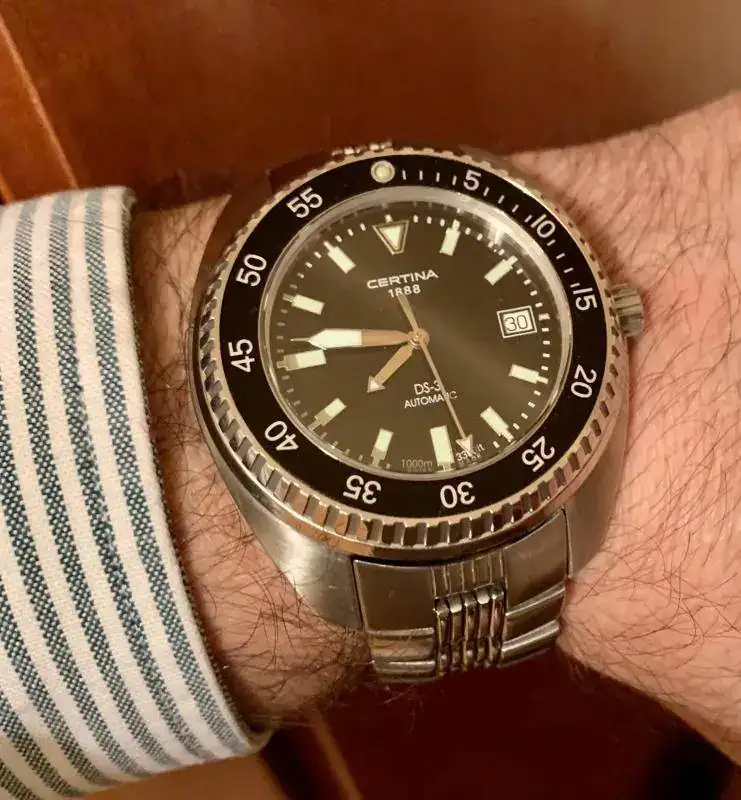 El Certina DS3 1000m es el más especial. Soy uno de los 1888 afortunados en todo el mundo en tenerlo ya que fue una edición limitada y que va costando conseguir a un precio razonable. Es una bestia de 1000 metros y eso se nota en su caja, bisel y cristal. Aunque extrañamente es muy cómodo y compensado. Un reloj herramienta.