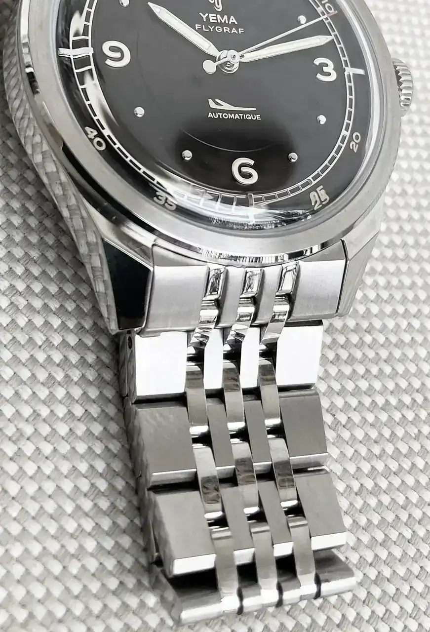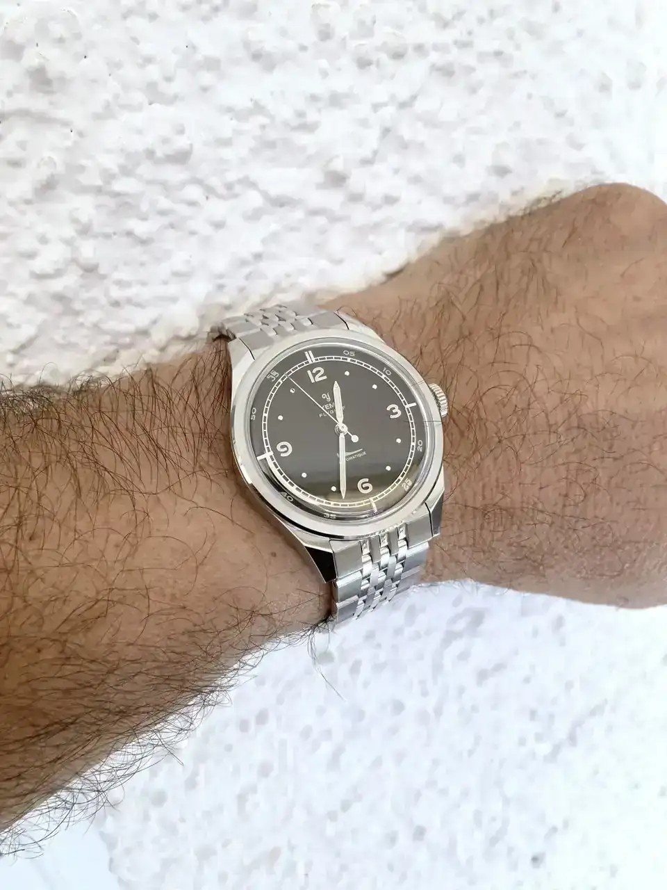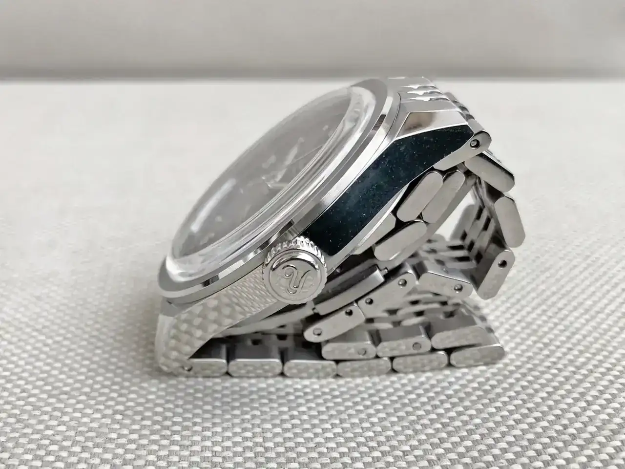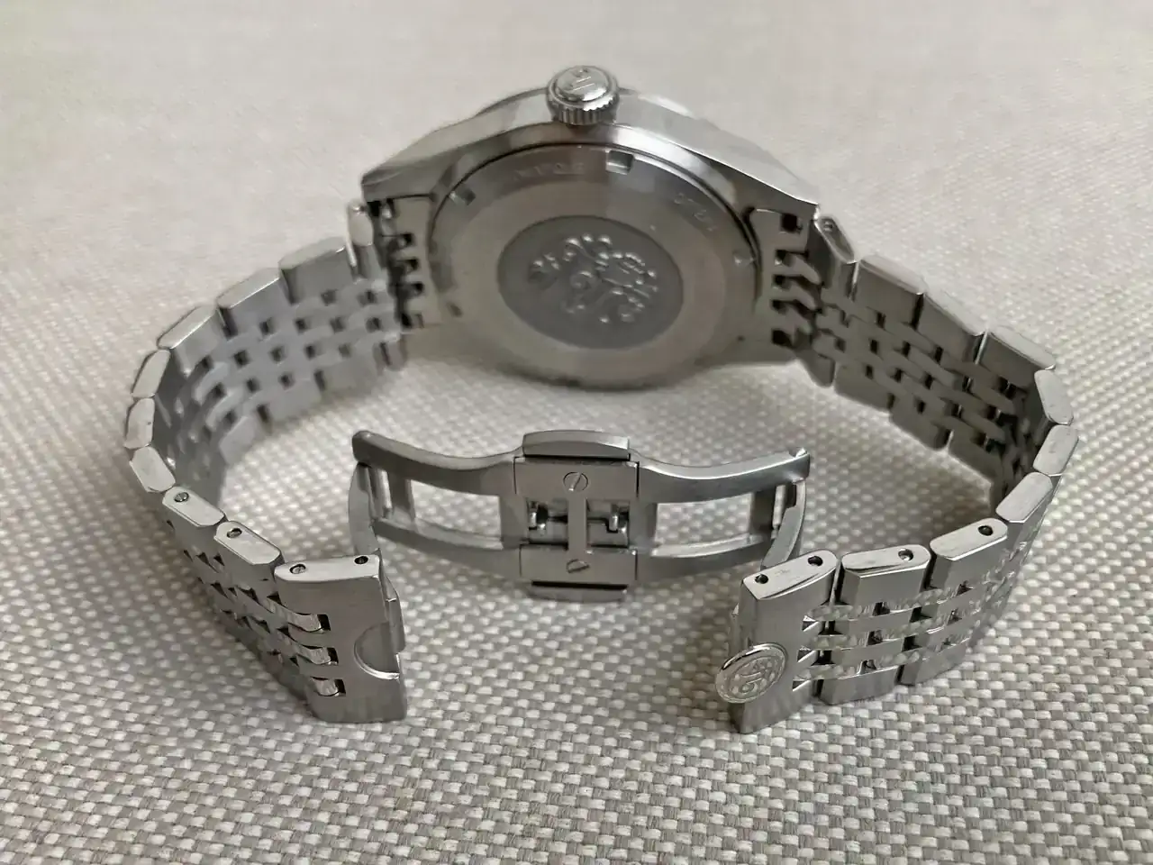 El brazalete, de siete eslabones ¡facetados!, se articula perfectamente y se adapta igual de perfectamente a la muñeca. Encima, no pellizaca ni piel ni vello. El cierre de dos pliegues y doble pulsador, es fácil de accionar, y solo le pondría la pega de que necesitas cerrarlo por orden por aquello del logo. Eso, y que no trae ni microajuste ni medios eslabones, aunque esto último tal vez sea un inconveniente menor debido a la reducida medida estàndar de los propios eslabones. Los pasadores son a presión y en el interior del brazalete encontramos las flechas de dirección. Endlinks macizos que encajan a la perfección con las asas. Combina acabados cepillado y pulido a espejo, lo que a su vez lo hace combinar con el pulido de la caja misma. Los pasadores de serie se ven potentes, de manera que la seguridad está asegurada. No se indica la procedencia, por lo que podría ser tanto suizo como chino, y si el caso fuera este último pienso que no tendría nada que envidiar al primero.