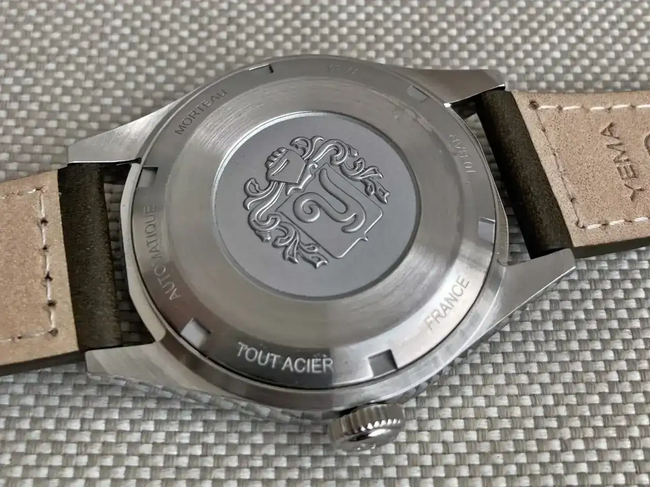 La resistencia al agua se ha establecido en 10 BAR / 100 metros, suficiente, en mi opinión, para un reloj de estas características. De asa a asa (L2L) mide 46 mm, perfecta para una muñeca de 18 cm de perímetro como es el caso de la mía. La tapa trasera -ciega- muestra el logo de la marca y en el perímetro información sobre el reloj: AUTOMATIQUE-MORTEAU-YEMA-10 BAR-FRANCE-TOUT ACIER. Este último dato evoca la época en que no todas las cajas -especialmente las francesas-eran de acero.