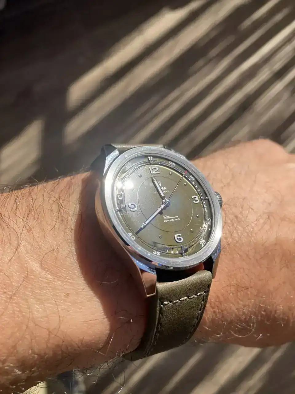 La esfera, de sectores, fue lo que primero me llamó la atención cuando vi el Flygraf por primera vez. Bastante compleja por sus índices y el propio capítulo de minutos aplicados en lugar de pintados, tiene un rebaje concéntrico que ayuda a equilibrarla visualmente. Los minutos, en múltiplos de 5, quedan en el exterior del anillo, en los "sectores" marcados por los puntos de 15, 30, 45 y 60 minutos. Tanto estos como la SuperLuminova (grado A) de los índices cardinales -y el de las agujas- tienen un tono ligeramente tostado que evoca el viejo tritio. Y hablando de agujas: la segundera tiene el extremo pintado en rojo, llamativo y discreto a la vez. La literatura en la esfera (el logo, la marca, el modelo, la silueta y la palabra "automatique" quedan dentro de lo aceptable, siempre en mi opinión. También en mi opinión, es de agradecer que este modelo no traiga ventana de fecha en aras de la simetría. Dos colores, negro o verde oliva, muy militar.