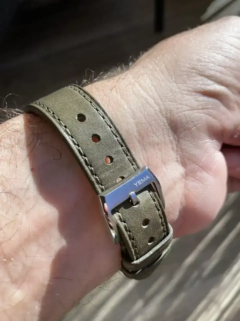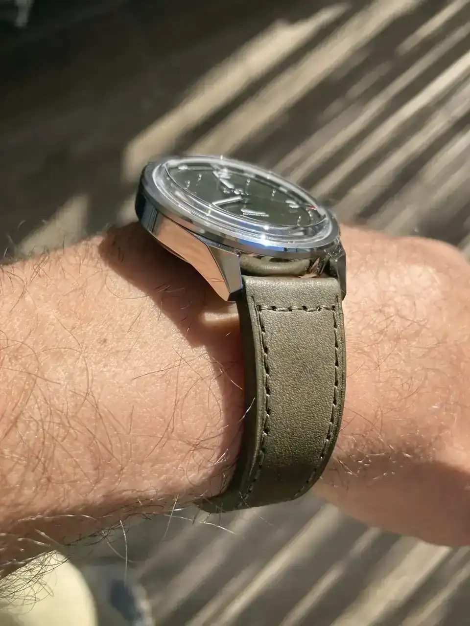 La correa de piel, por su parte, sí explica su procedencia ("un artesano de la región, Franche-Conté"). La textura es muy agradable y flexible, lo que hace innecesario tener que "domarla". Curiosamente, no es de 20 mm entre asas sino de 19, otro guiño a los vintage,y decrece hasta los 16 mm de la hebilla (cepillada y grabada con el nombre de la marca), que se ve y percibe de calidad. Acostumbrado como estoy a ver correas de excelentes artesanos locales, esta me ha parecido un tanto industrial en el cosido, aunque para nada desmerece el resultado final. Por cierto, el ancho del brazalete también decrece de 19 a 16 mm.