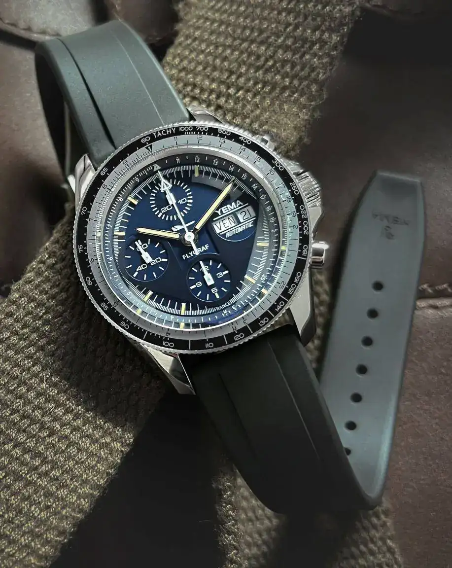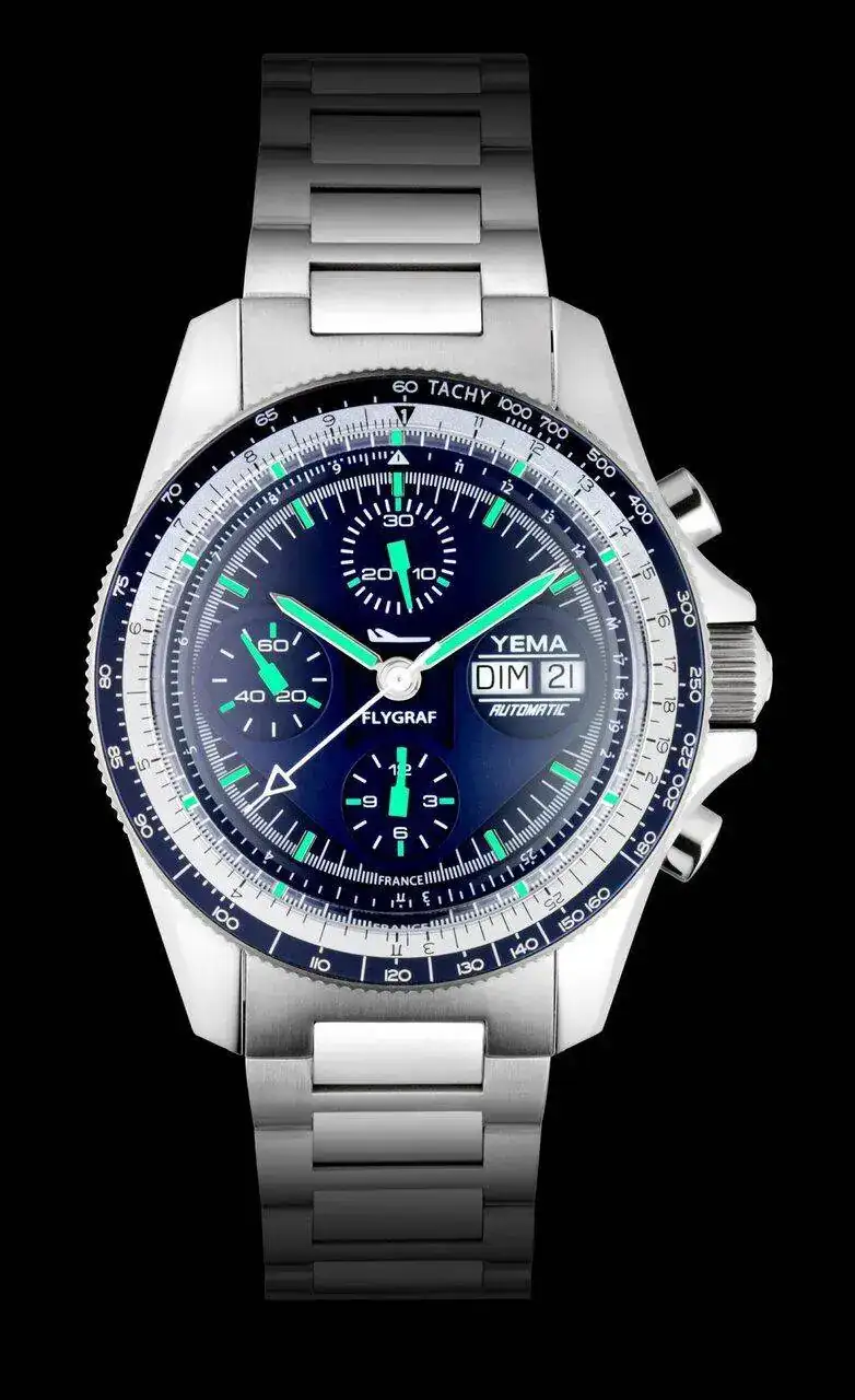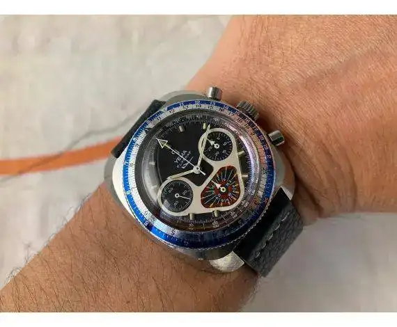 El movimiento es el calibre ETA automático suizo Valjoux 7750 con 25 joyas, 28.800 vph y una reserva de 48 horas. Las funciones son: horas, minutos, segundos pequeños a las 9 en punto. Función de cronógrafo con contador de 30 minutos al mediodía y contador de 12 horas a las 6 en punto. Segundos del cronógrafo central. Día y fecha.