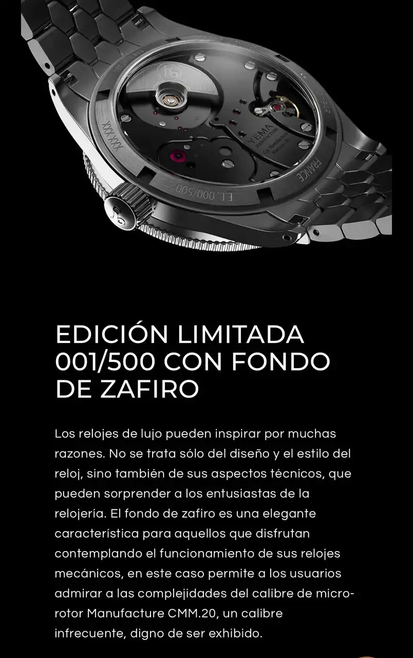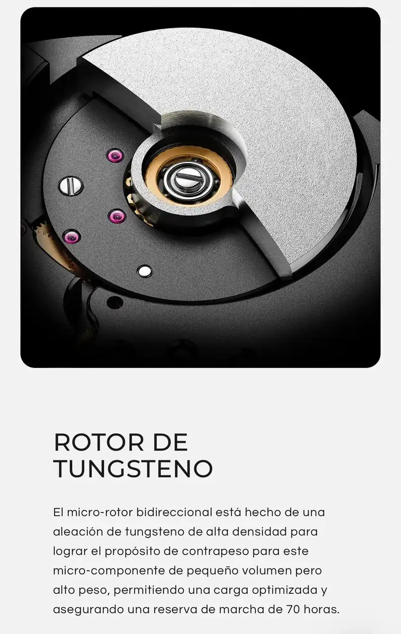 Según el fabricante este calibre manufactura con microrotor es un 26% más fino que un calibre ETA 2824, lo que permite que el grosor del reloj sea de tan solo 10mm.