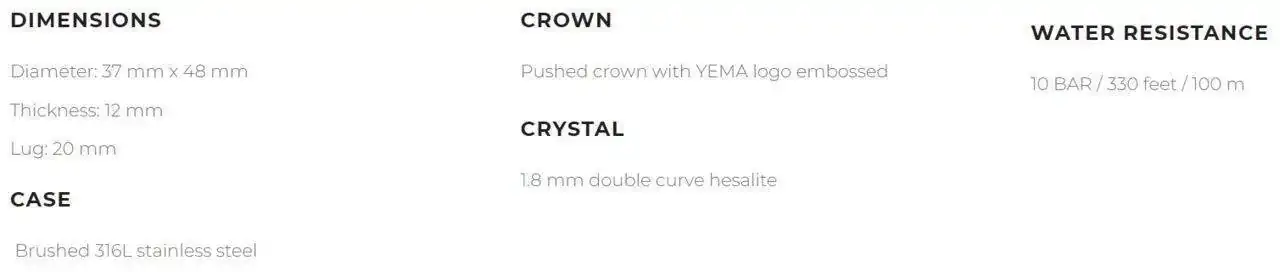 Reloj bien ejecutado, diseñado, con unas medidas que al principio "dudas" pero que luego te sorprende cuando te lo pones. Se nota calidad y ese savoir-faire de la casa Yema. Creo, en mi humilde opinión (y que es personal), que han sabido plasmar todo aquello de antaño en este reloj. Caja, cristal, estructura, esfera, medidas y dándole un plus instalando un calibre in-house y edición limitada de 100 unidades. Quizás, para poner algo en el otro lado de la balanza, la correa la veo un poco gruesa, poco, pero creo que ese elemento es el que menos dolor de cabeza nos podría dar ante la facilidad de hacerle un cambio nosotros mismos.