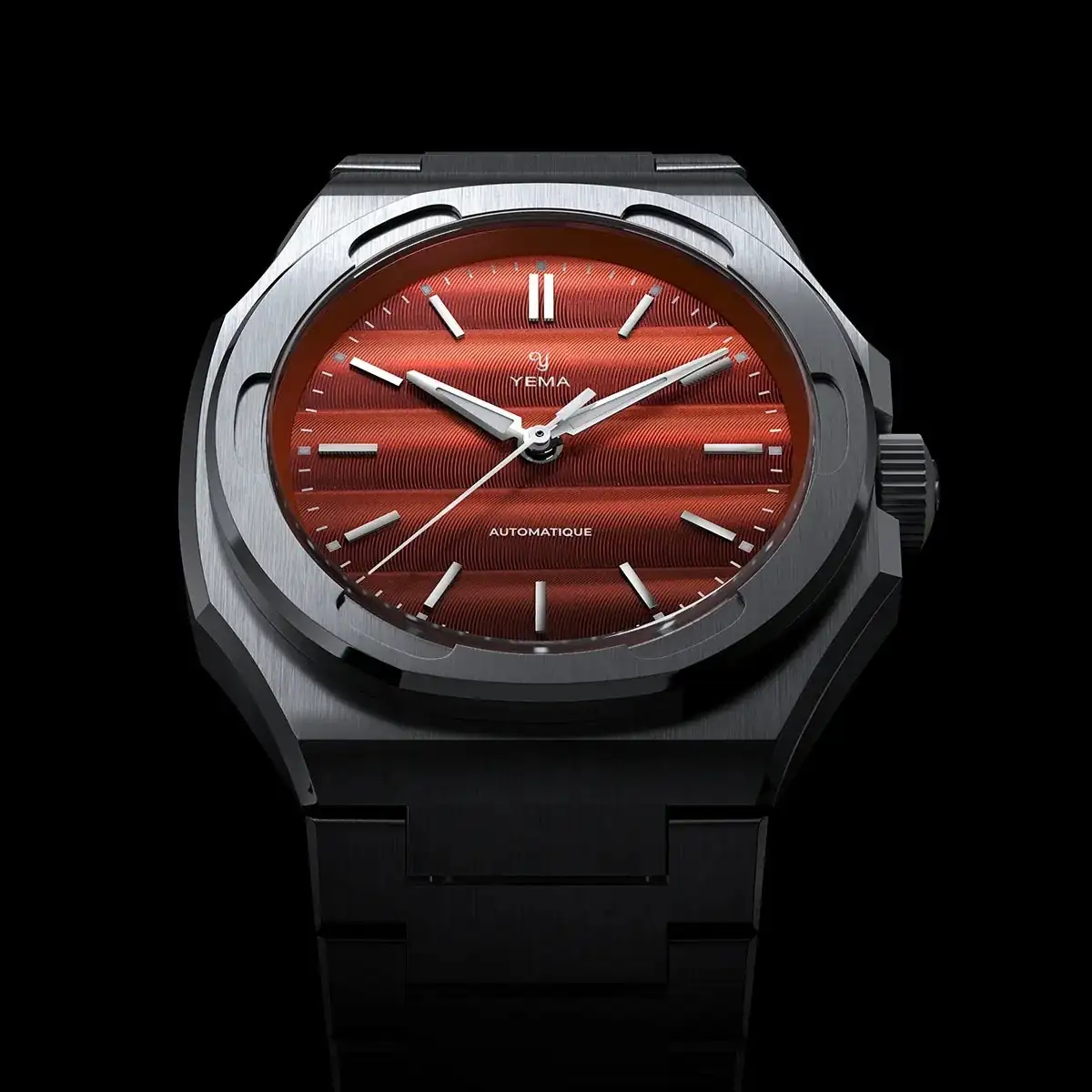 Esta iniciativa me dio la idea de proponer a otro viajero para que pueda ser fotografiado (y convenientemente manoseado) por los foreros que quieran apuntarse. Como muchos sabréis, tengo establecida una colaboración con YEMA para dar a conocer (más) sus relojes entre la comunidad de habla castellana, y se me ha ocurrido elegir un modelo y una versión que es posible que no esté en muchas colecciones, lo que en mi opinión lo haría más atractivo: se trata del Yema Wristmaster Traveller, con su peculiar esfera "Cotes de Geneve" (roja) y que monta el a punto de descatalogarse calibre automático YEMA2000.