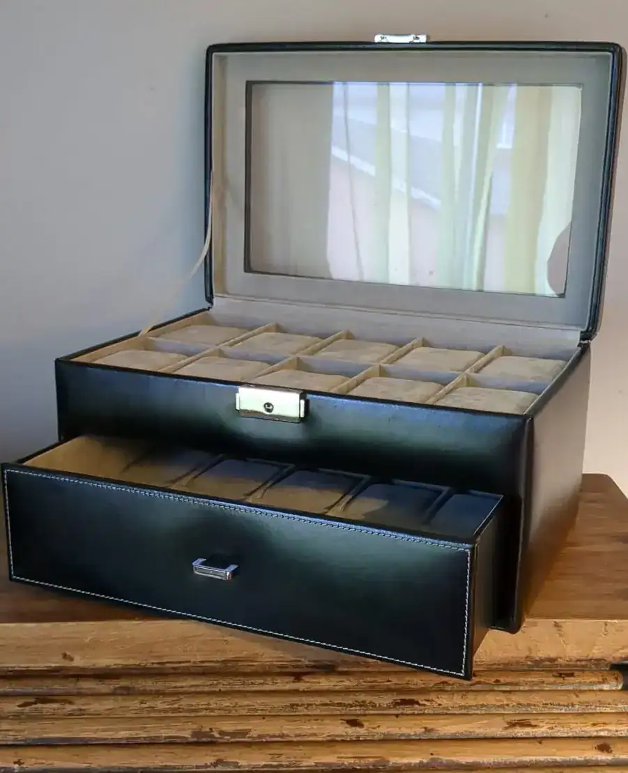 De siempre tenía una caja de 6 y 7 relojes, más el Casio. Me robaron uno, del que me quedó un práctico estuche de viaje para dos relojes QUE SOLO USO DE VIAJE 😆.