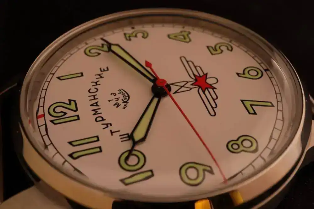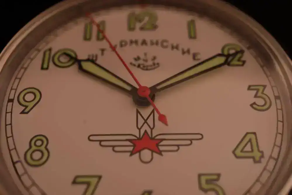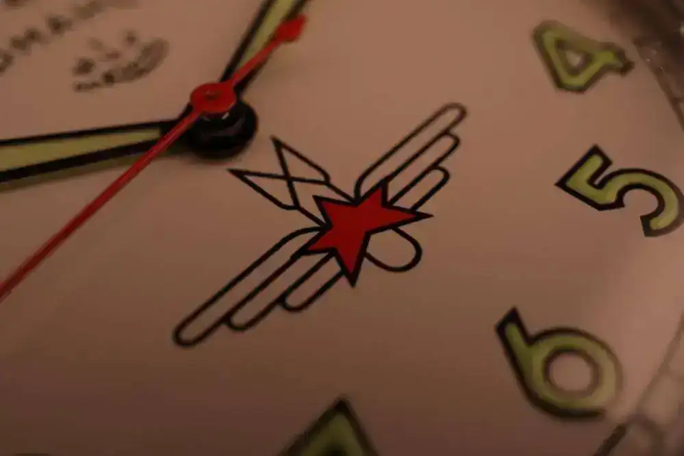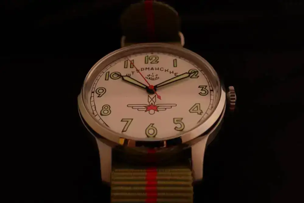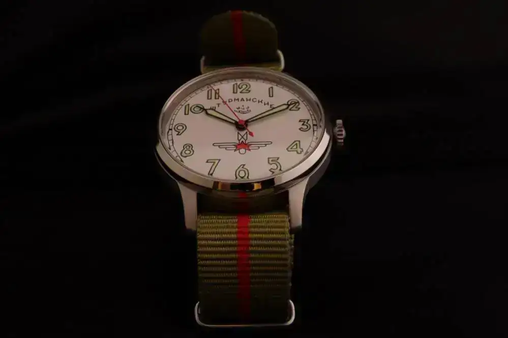 En este caso recobro un reloj que se fraguo en otro foro y que trae remembranzas de la relojería soviética relacionada con el espacio. Es una puesta al día del reloj que porto Juri Gagarin al espacio, eso si, con un tamaño mas del gusto de lo que ahora se lleva. El calibre es sencillo y de remonte manual. La esfera tiene la grafía del constructor y los símbolos soviéticos y de aviación. Los números son pintados y se ven muy bien en la oscuridad por la aplicación pertinente para estos fines. La nato es de mi cosecha particular pues creo que los colores combinan perfectamente.