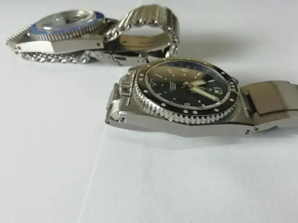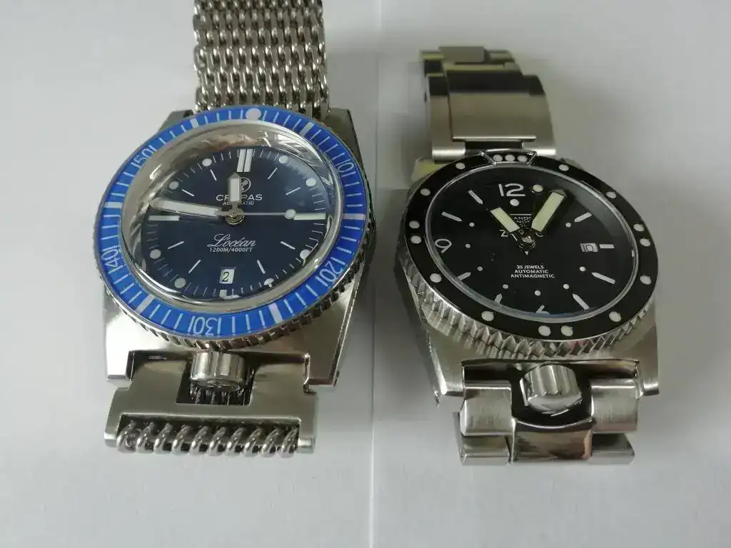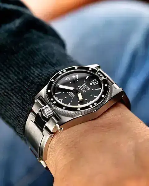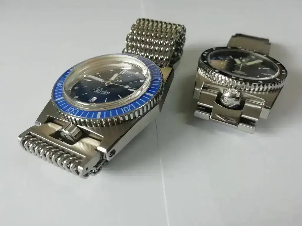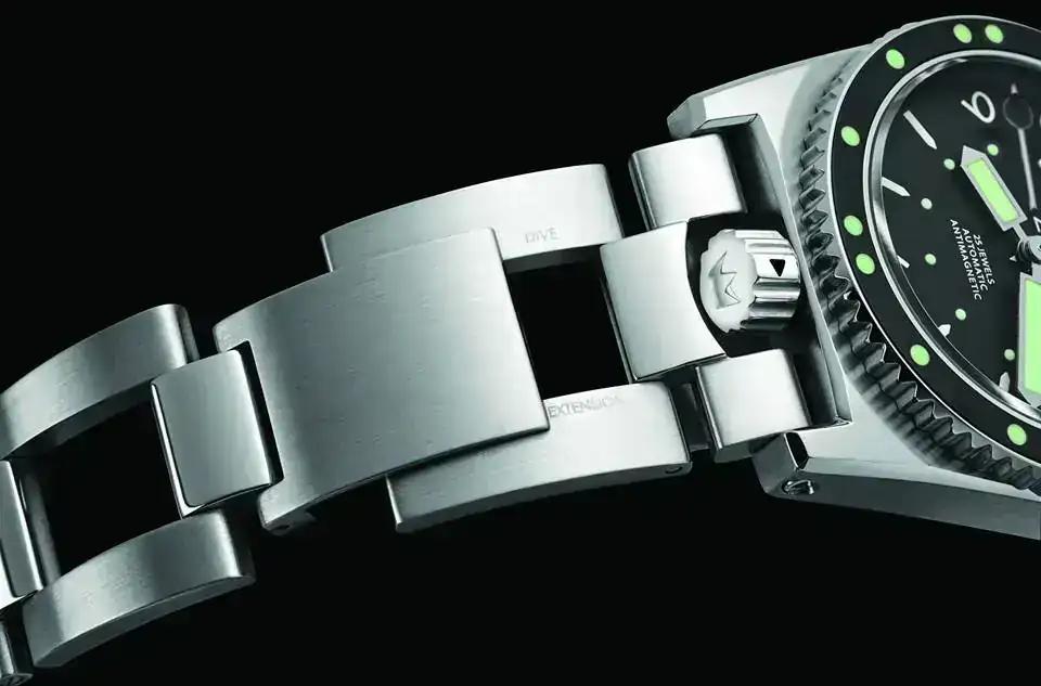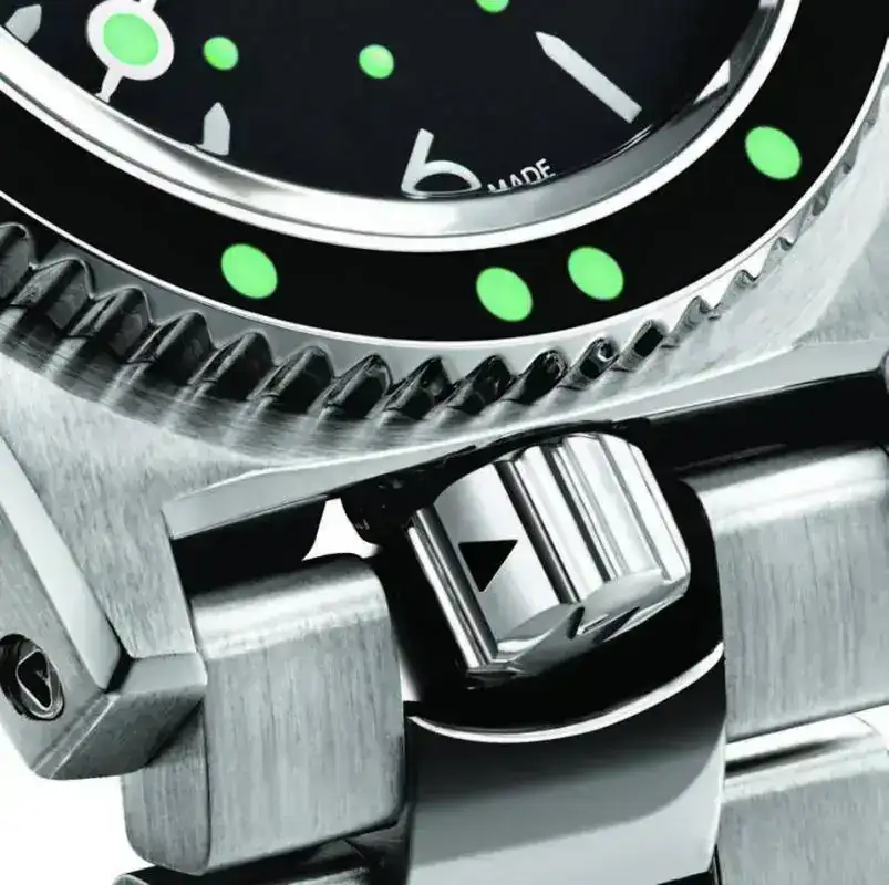 Diseñaron un brazalete extensible que evitaba ajustar a la talla cada vez que el reloj se llevaba en un traje de neopreno distinto. Incorporaron unas agujas sobredimensionadas llamadas “magnum” y unos índices luminosos tratados con tritio.