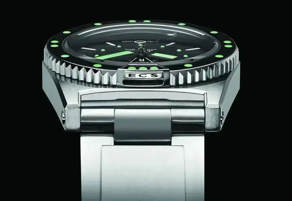 BISEL: El bisel cuenta con un sistema patentado de fácil impiado después de una inmersión en agua marina el sistema ECS™ Patent pending (Easy Clean System), por el cual se evita que los cristales de la sal puedan estropear la rotación del bisel, pues un conducto interior permite que pueda circular el agua y pueda limpiarse mas fácilmente evitando así que la cristalización de la sal del agua después de varias inmersiones.