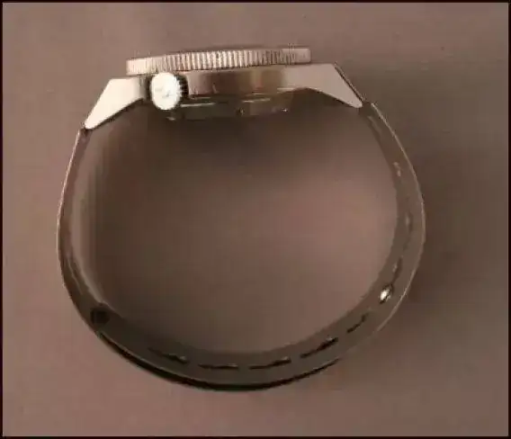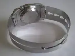 CORREA: Un brazalete metálico con unos eslabones flexibles a ambos lados de la caja, completa el conjunto, lo que permite ajustar el brazalete a distintos gruesos, pensando en el uso de los trajes de neopreno de distintos gruesos o incluso en el caso de que no se vaya a usar neopreno, de manera que se evita el ajuste manual. Es una solución sencilla en su concepción pero muy efectiva y práctica.