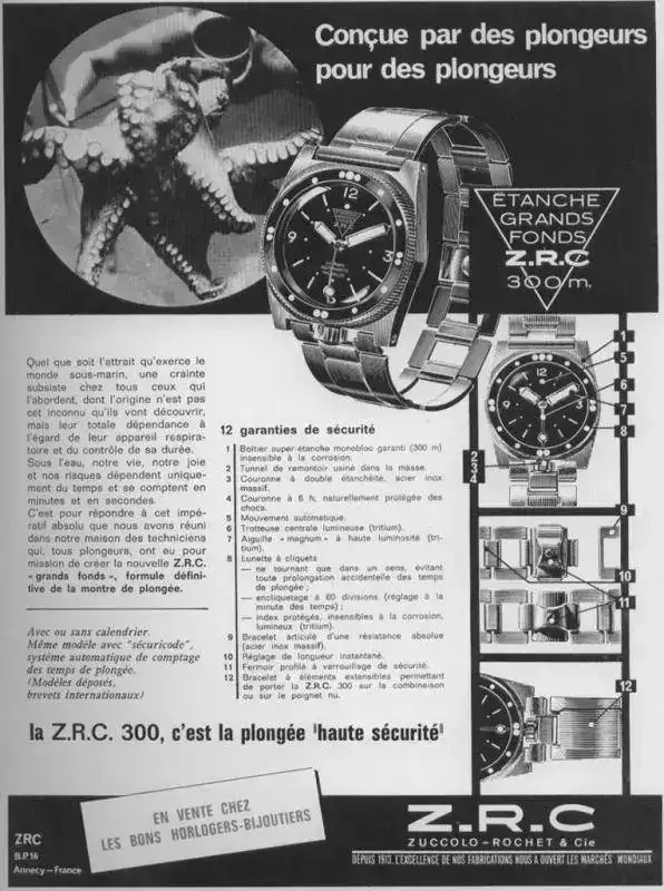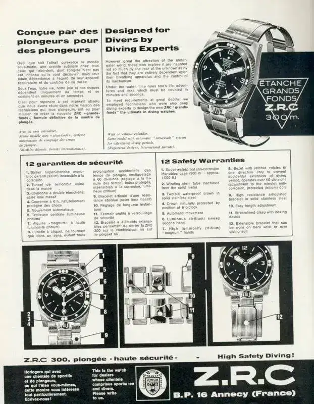No quiero dejar pasar la oportunidad de recordar que ZRC también produjo otros relojes como el ZRC “Securicode” que permitía el cálculo de los tiempos de inmersión a diferentes profundidades; o el ZRC “Spatiale”, del que se hizo una versión “Le Jour” para el mercado americano. Estaban equipados con movimientos Ebauche (ETA), Felsa, Durow o PUW, dependiendo de los modelos.