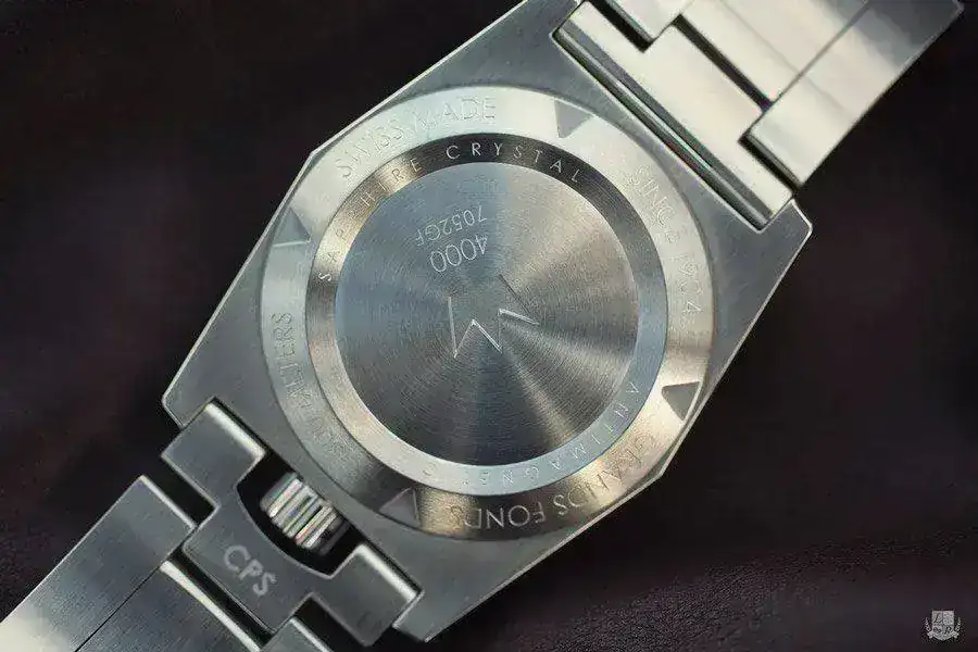 FONDO: Fondo con tapa roscada y con una forma peculiar que hace que el centro de la tapa esté a un nivel distinto de la parte exterior. Hay tres niveles de leyenda: En la parte más exterior; “GRANDS FONDS 300 METRES SWISS MADE SINCE 1904”, en una parte intermedia: “ANTIMAGNETIC SAPHIRE CRYSTAL” y en el centro un triangulo invertido con la leyenda “ZRC Grands Fonds 300”.