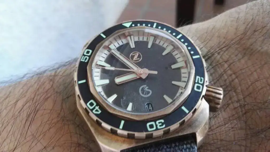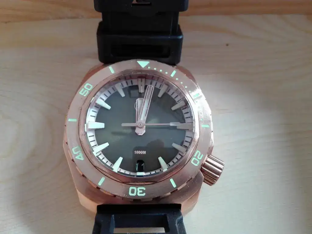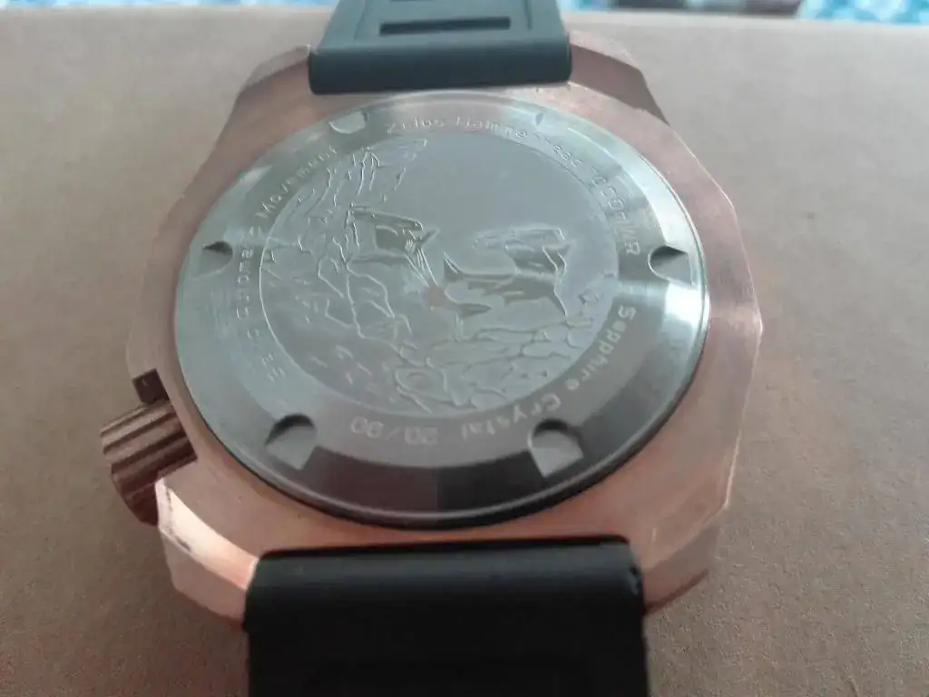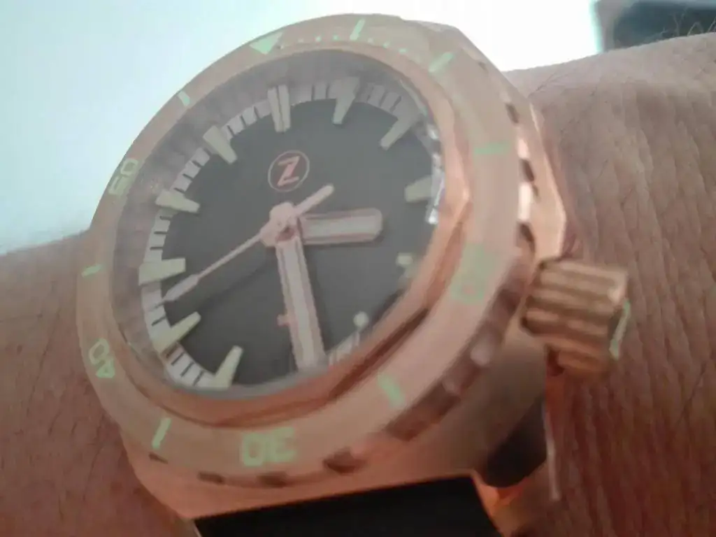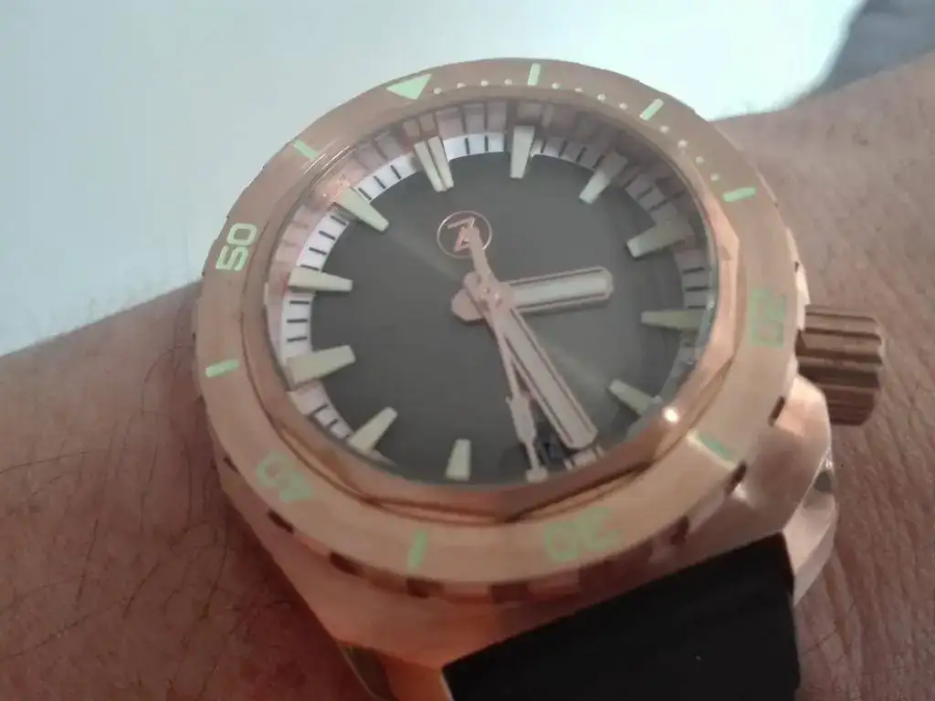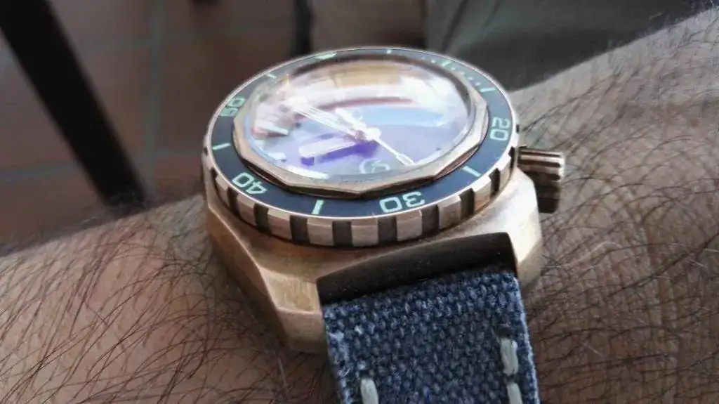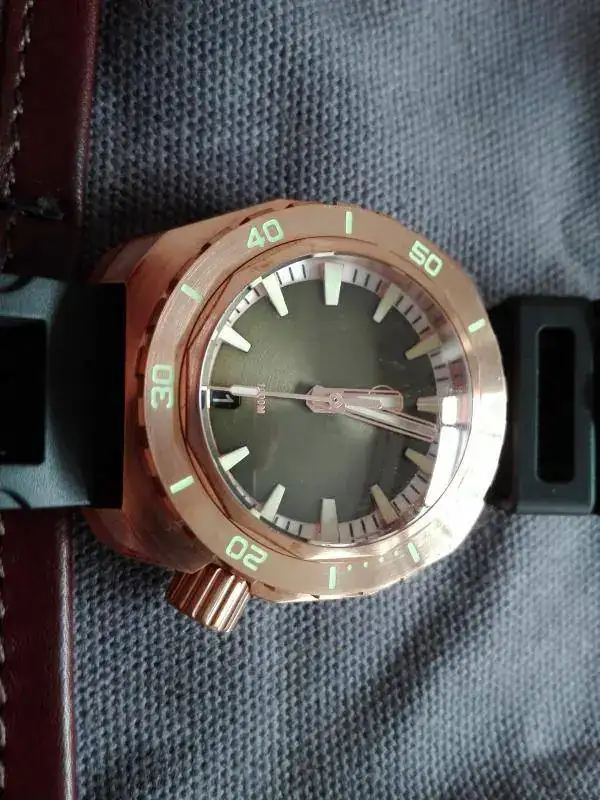 Yo tengo un bronce con dial meteorito desde hace algunos meses y no puedo estar más satisfecho, me parece un reloj magnífico y que se sale de lo habitual y por cierto la patina que está cogiendo una pasada. Y para muestra un botón.