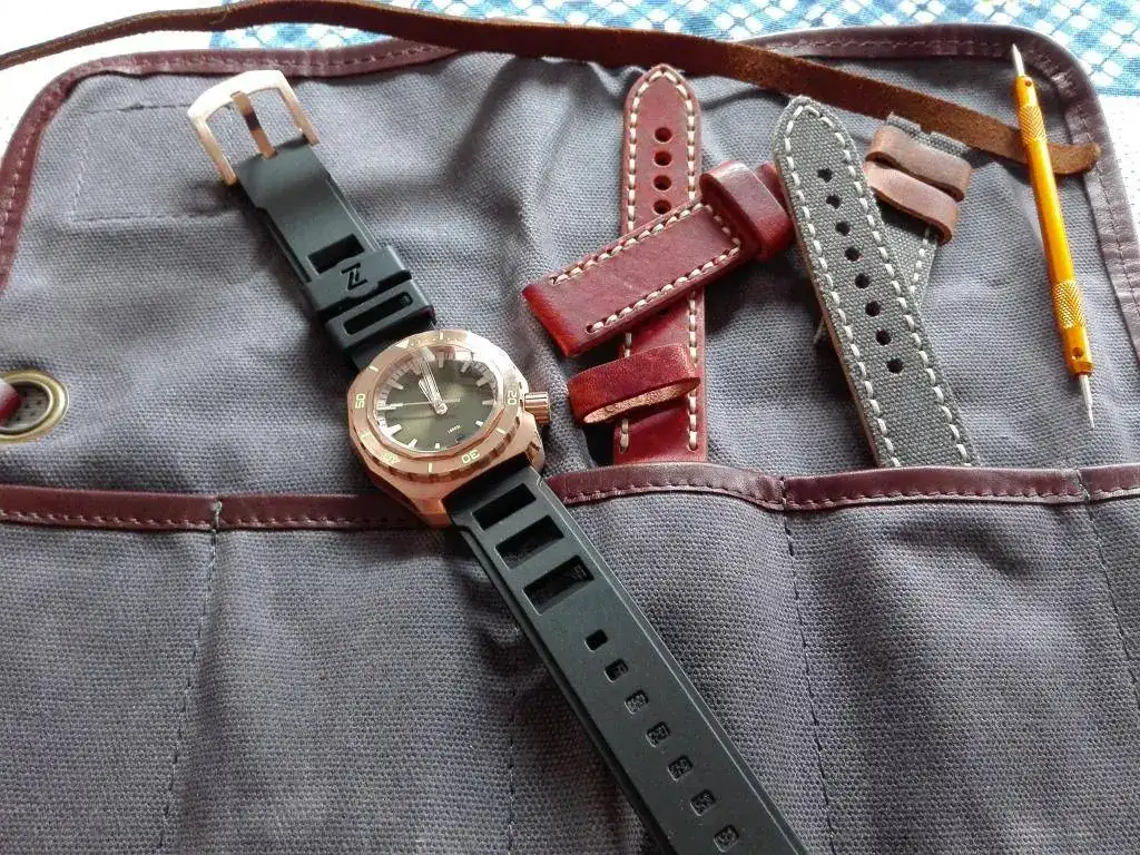 La dotación es la que se ve: roll, correa de piel, correa canvas con interior de piel, herramienta de cambio de correa y el hammerhead con correa de goma.