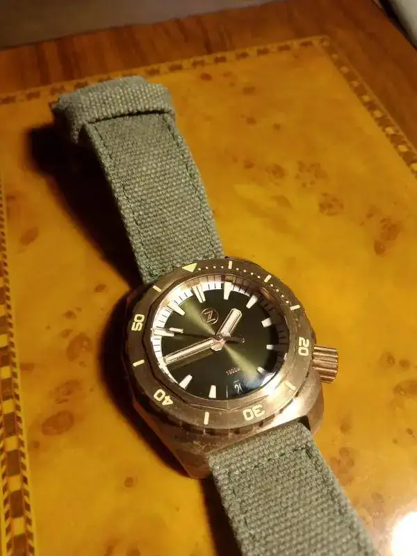 ), de sacar de la caja aquellos relojes que no uso por mucho que me gusten, saco al FCV este Zelos de bronce que si bien me encanta contemplar en la caja, lo cierto es que me lo he puesto en contadas ocasiones por no ser de mi estilo.Se trata de un Zelos Hammerhead de bronce con un precioso dial color verde oliva, que intento reflejar con diferentes condiciones de luz en las fotos con no demasiado éxito. El reloj está en un estado excelente, ya que me llegó en perfectas condiciones y como digo, contaré con los dedos de una mano las veces que lo he llevado puesto. Presenta una ligera patina que a mi me parece muy bonita, nunca lo he mojado ni nada por el estilo lo que supongo que hará que no tenga demasiada.