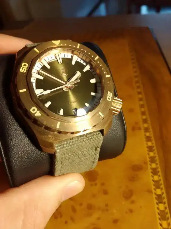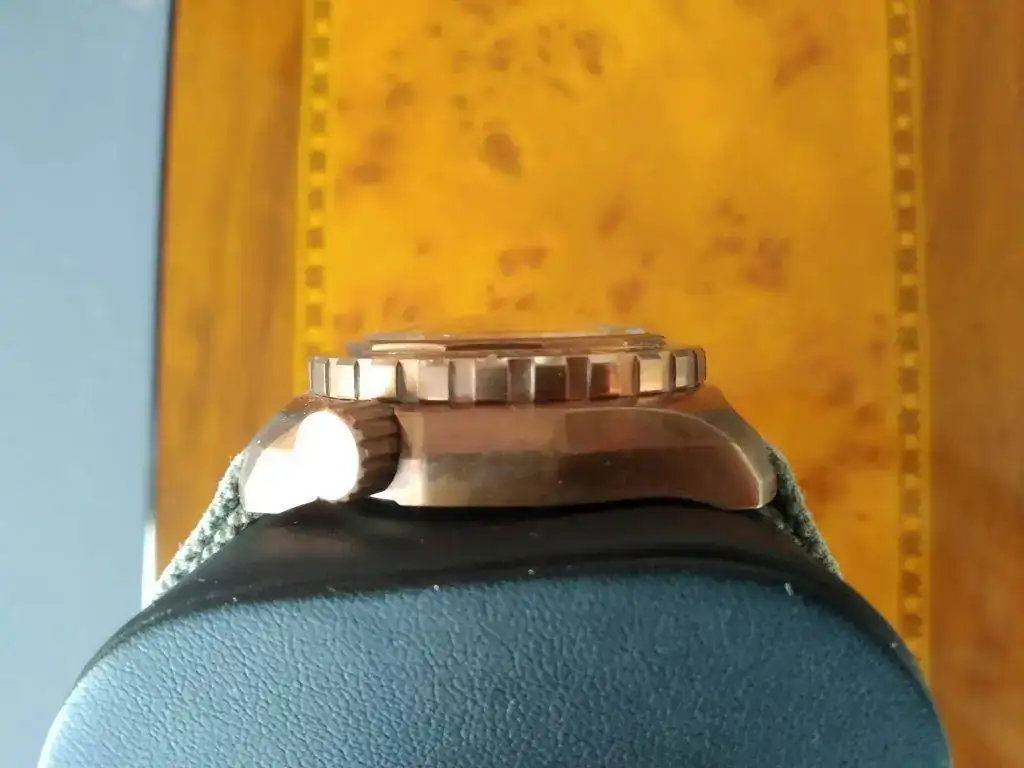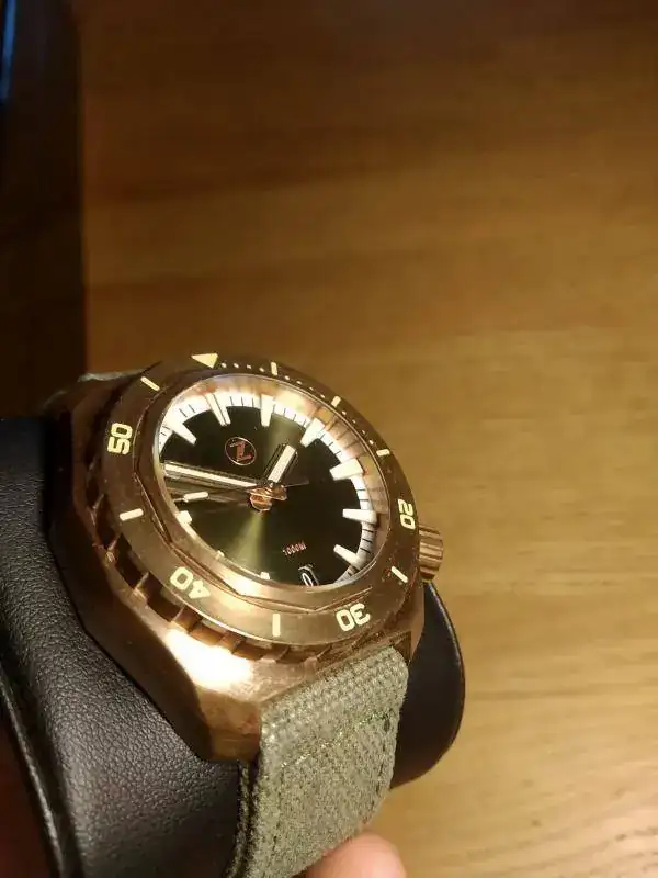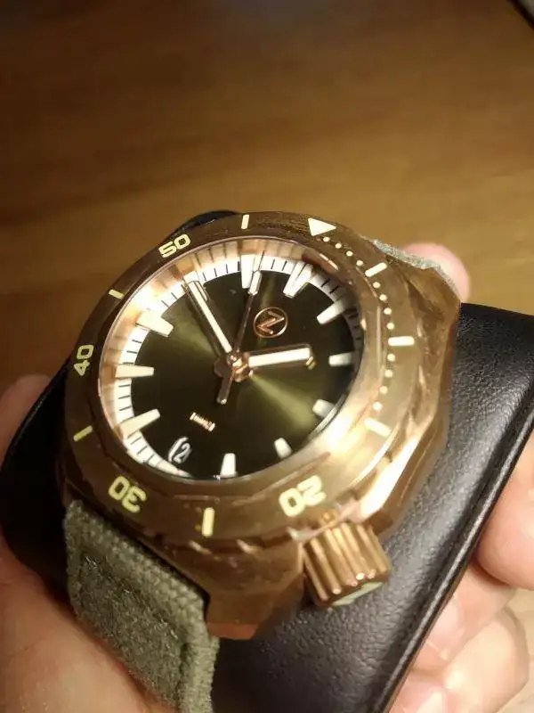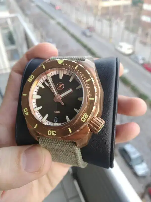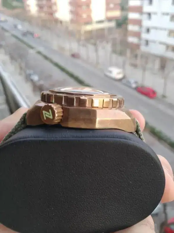 Se trata de un Zelos Hammerhead de bronce con un precioso dial color verde oliva, que intento reflejar con diferentes condiciones de luz en las fotos con no demasiado éxito. El reloj está en un estado excelente, ya que me llegó en perfectas condiciones y como digo, contaré con los dedos de una mano las veces que lo he llevado puesto. Presenta una ligera patina que a mi me parece muy bonita, nunca lo he mojado ni nada por el estilo lo que supongo que hará que no tenga demasiada.