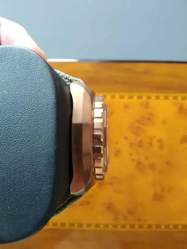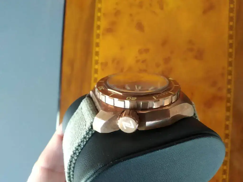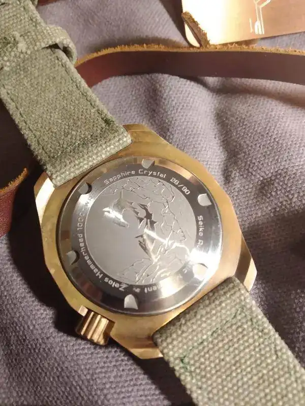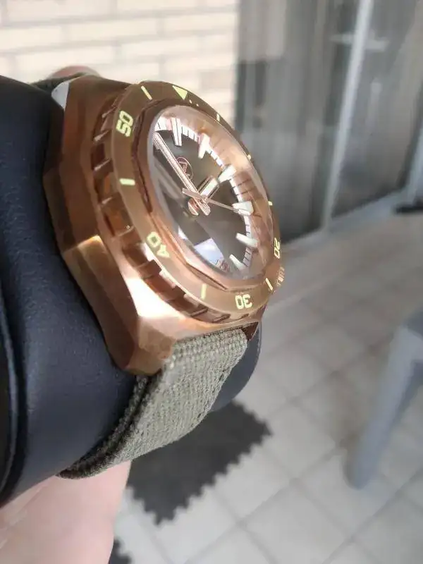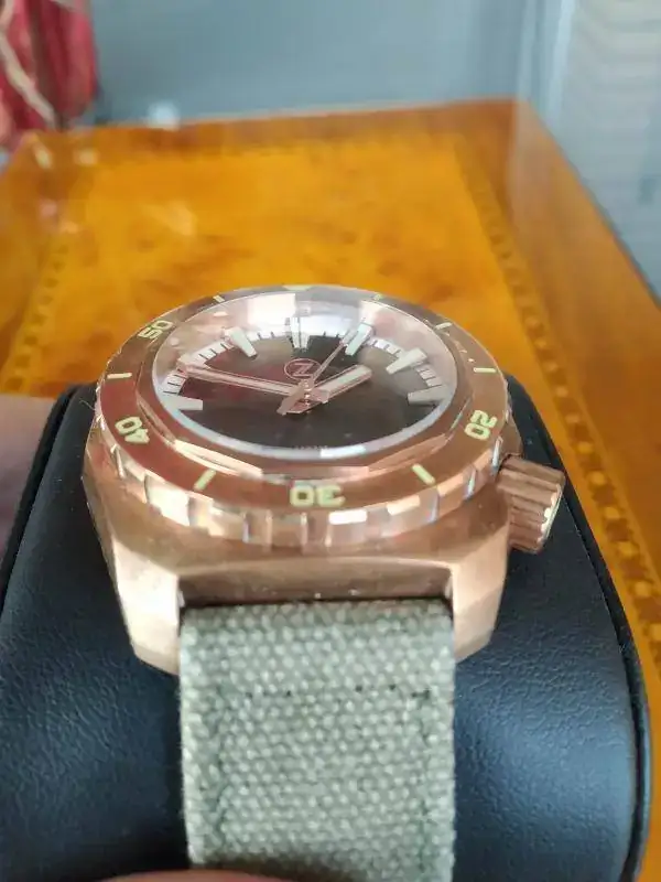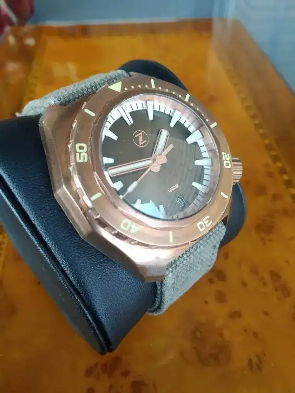 Se trata de un Zelos Hammerhead de bronce con un precioso dial color verde oliva, que intento reflejar con diferentes condiciones de luz en las fotos con no demasiado éxito. El reloj está en un estado excelente, ya que me llegó en perfectas condiciones y como digo, contaré con los dedos de una mano las veces que lo he llevado puesto. Presenta una ligera patina que a mi me parece muy bonita, nunca lo he mojado ni nada por el estilo lo que supongo que hará que no tenga demasiada.