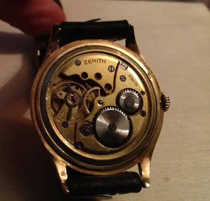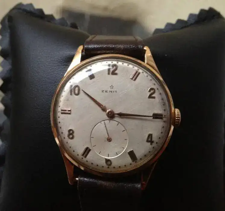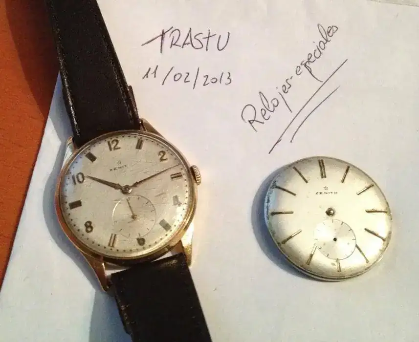 saco a la venta un bonito Zenith con calibre 106-6 de oro mazizo con 11gramos de oro de 18K. El reloj es muy bonito, pero por la compra de uno nuevo este tiene que salir. El reloj tiene asas fijas y por eso lo acompaño con una correa de piel antigua. La esfera es muy bonita, el único problema que tiene es que la h de zenith está borrada al igual que el índice de 50segundos es por eso que adjunto como regalo una esfera con todos los indices y letras por si el nuevo propietario prefiere cambiarla. Os dejo las fotos: