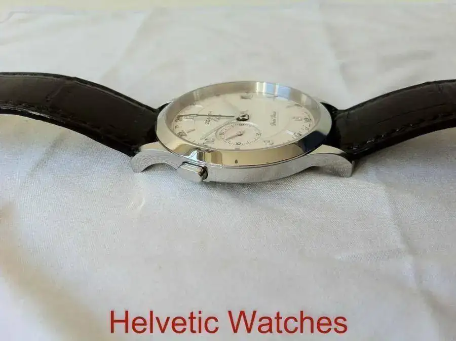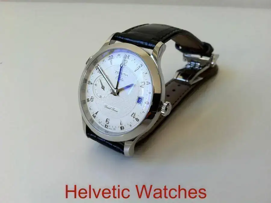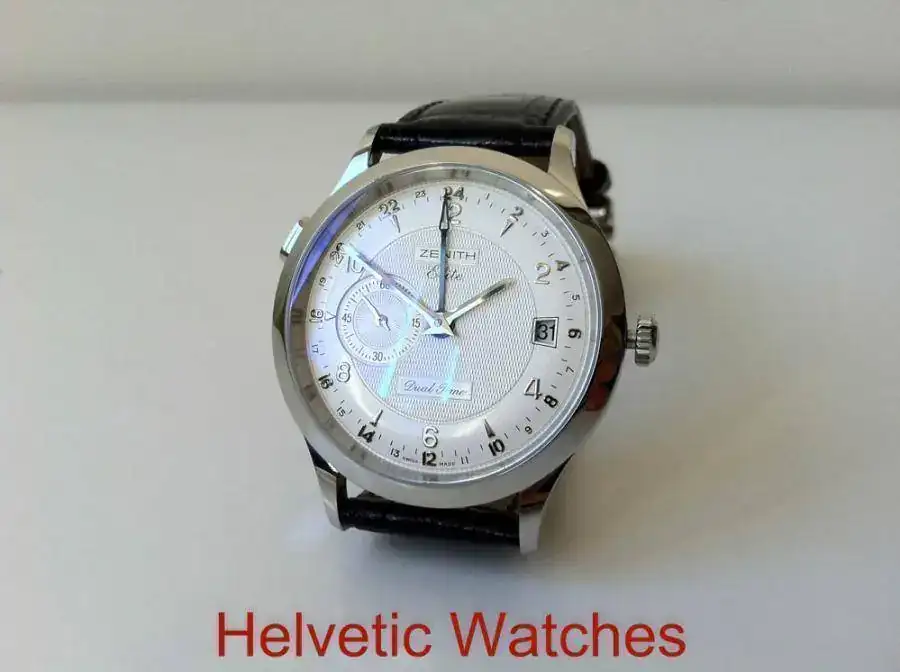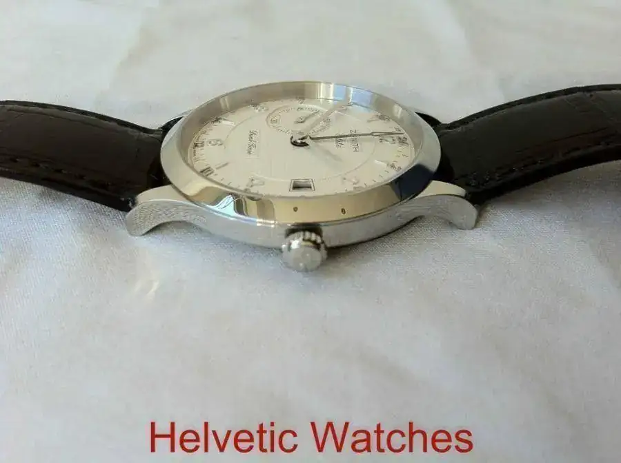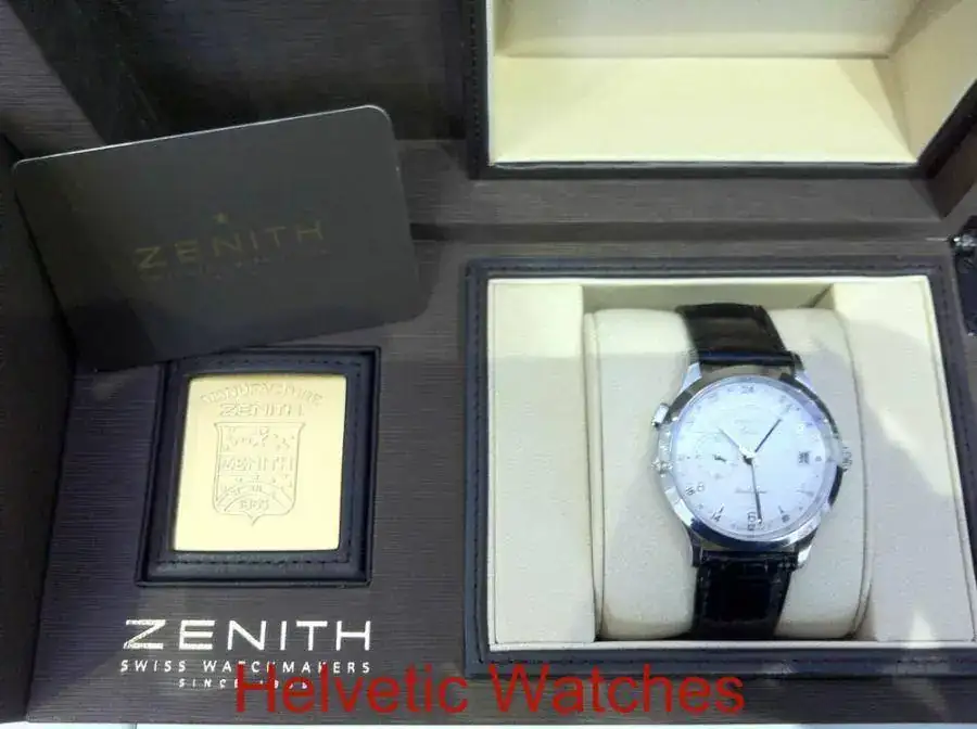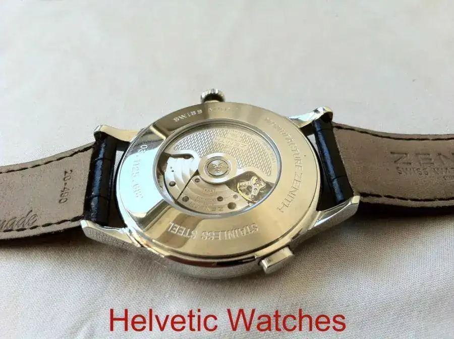 Reloj Zenith elegante y extraplano. Diseño clasico e intemporal con calibre automatico Elite de manufactura visible a traves del fondo visto, correa de cocodrilo negro con cierre desplegante.