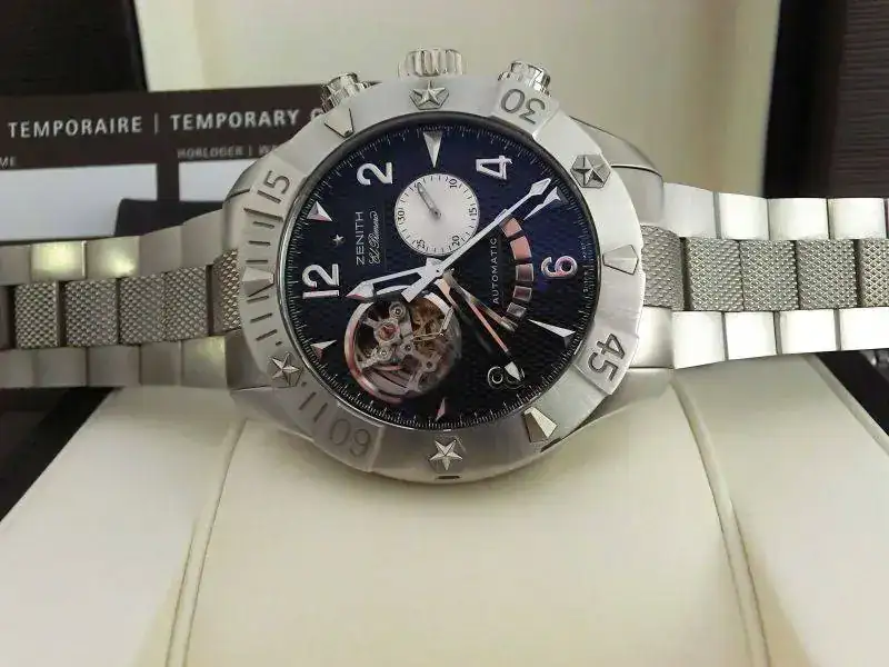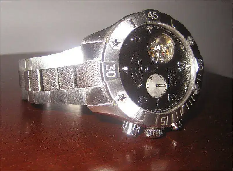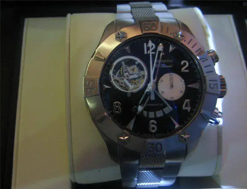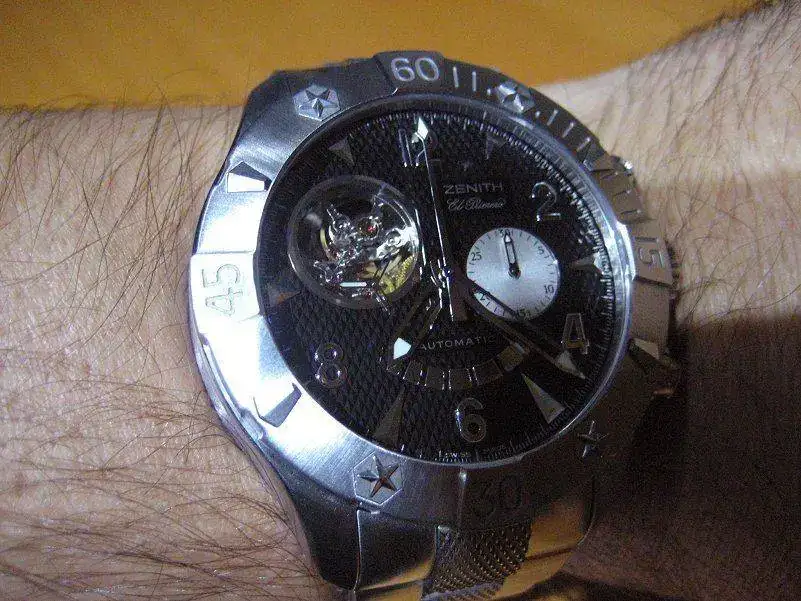 Es un reloj del que llevo enamorado desde hace tiempo, de hecho para mí es una de las creaciones más bonitas de la controvertida y a veces excesivamente extravagante época en la que Thierry Nataf estaba al mando de Zenith. Aunque los relojes grandes ya no llaman la atención como hace años, no suele dejar indiferente a la gente, en mi caso, la primera vez pude manosear este modelo fue con esfera gris plata y no negra: entré en la relojería donde lo tenían expuesto en un lugar preferente, me interesé por él, tras una agradable charla me lo probé, pregunté el precio, hice una pausa para respirar y dije seriamente “Algún día….”. Así comenzó el idilio.