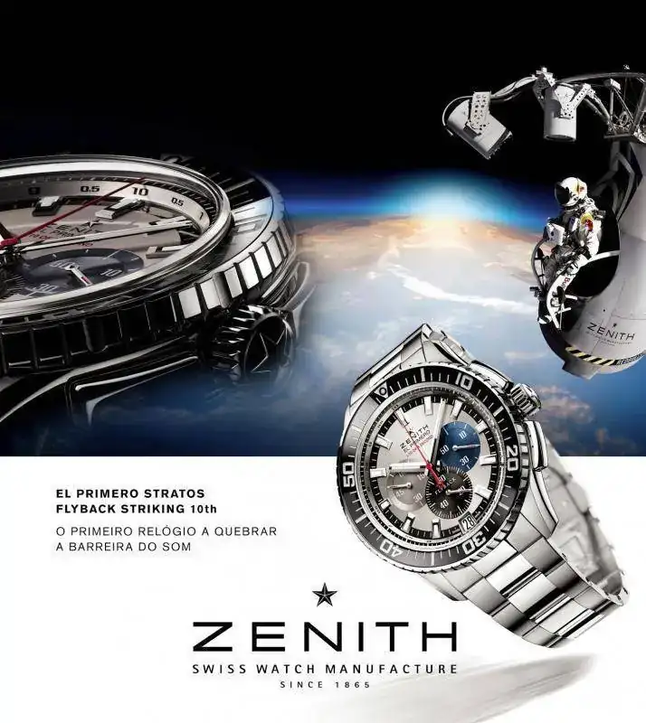 El 14 de octubre de 2012, el paracaidista austriaco Felix Baumgartner se convierte en el primer hombre en romper la barrera del sonido en caída libre, al saltar desde una cápsula espacial en el límite de la estratosfera y aterrizar en el desierto de Nuevo México tras un descenso de 38.969,4 metros. Zenith actúa como cronometrador oficial del histórico salto y el reloj que lleva Baumgartner al realizarlo es un Stratos Flyback Striking 10th de Zenith, que incluye el célebre movimiento El Primero.