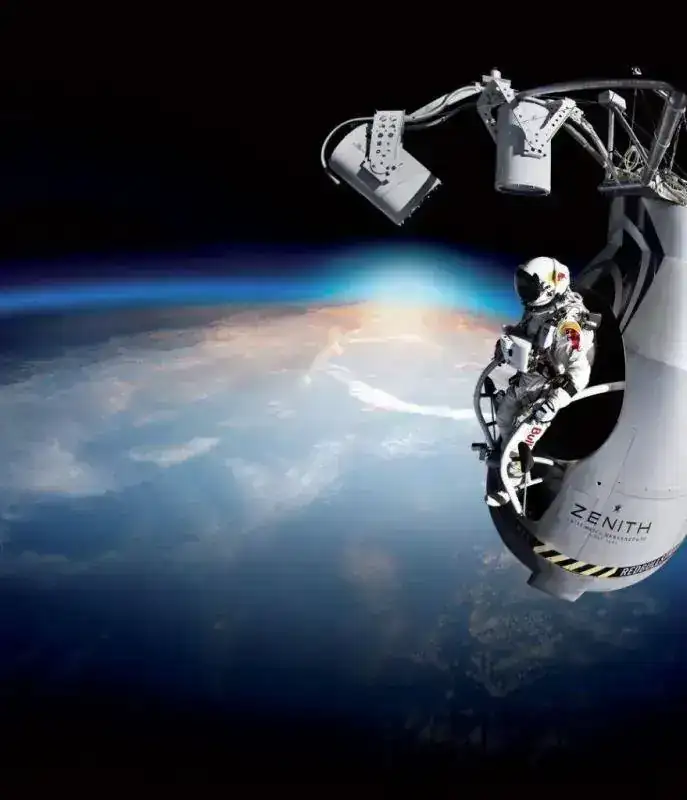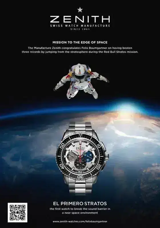 El 14 de octubre de 2012, el paracaidista austriaco Felix Baumgartner se convierte en el primer hombre en romper la barrera del sonido en caída libre, al saltar desde una cápsula espacial en el límite de la estratosfera y aterrizar en el desierto de Nuevo México tras un descenso de 38.969,4 metros. Zenith actúa como cronometrador oficial del histórico salto y el reloj que lleva Baumgartner al realizarlo es un Stratos Flyback Striking 10th de Zenith, que incluye el célebre movimiento El Primero.