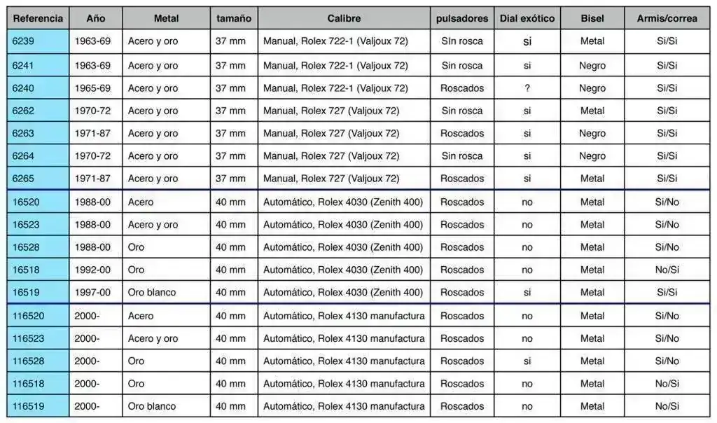 Reproduzco a continuación una tabla de los años y los numeros de serie de los Daytona que llevaron en su interior un calibre Zenith.
