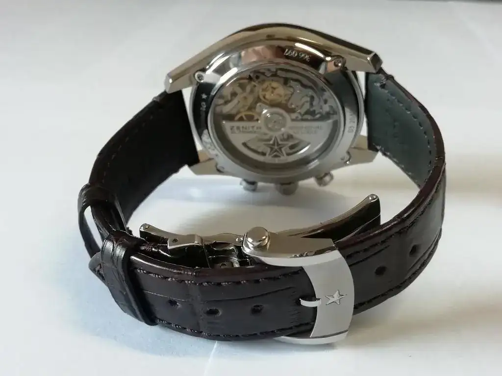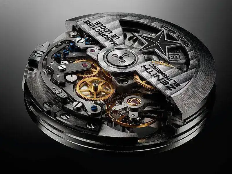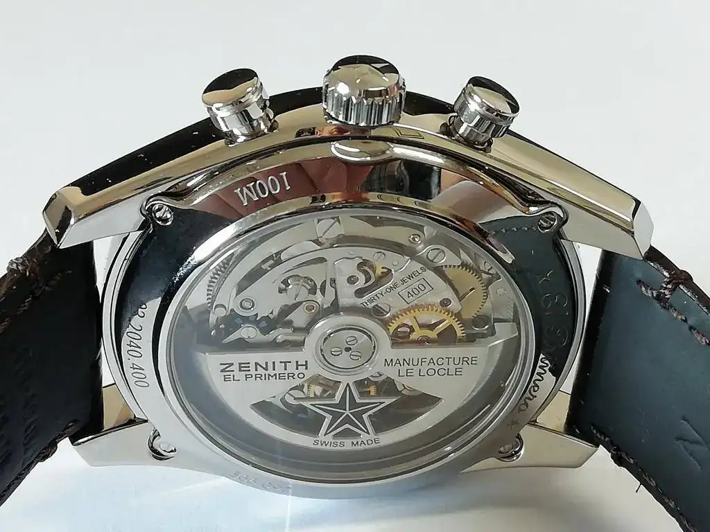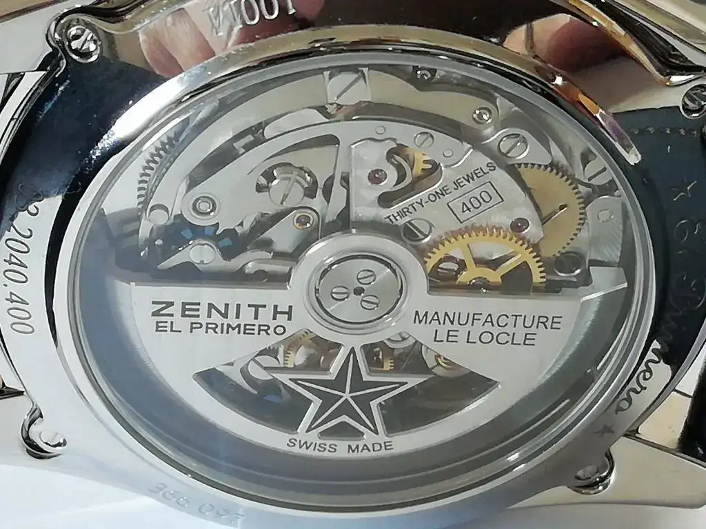 El fondo es visto, lo que convierte en un auténtico espectáculo la observación de su funcionamiento y de todos los piñones y engranajes que hay en su mecanismo. La masa oscilante está decorada con el perfil de la estrella de cinco puntas y la leyenda “ZENITH EL PRIMERO” Y “MANUFACTURE LE LOCLE”