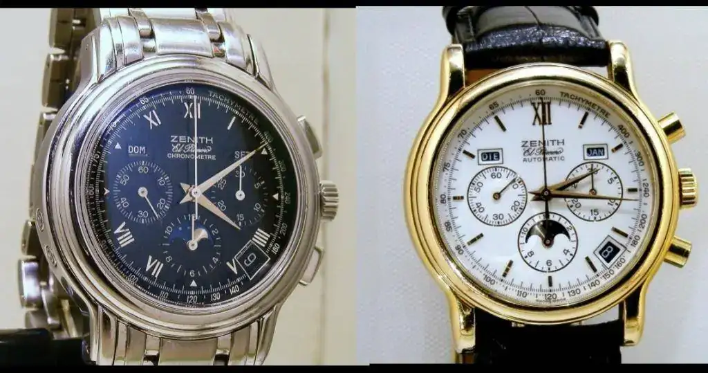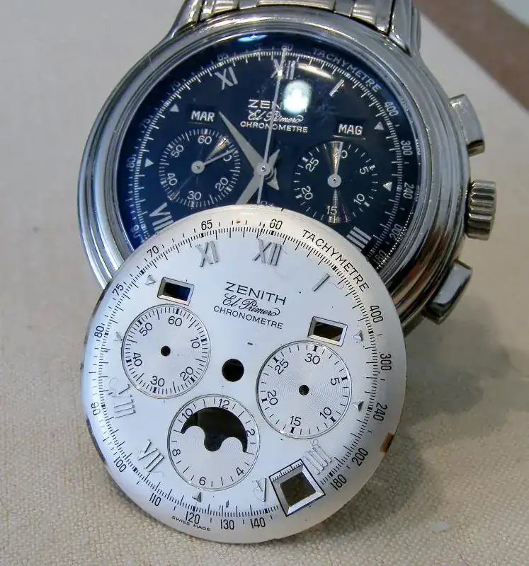 Esferas negras siempre difíciles de fotografiar, el reloj esta basicamente en excelente estado de funcionamiento, el armis a mi ya me llegó nuevo y yo apenas lo he usado, la caja del reloj es la que presenta algunas marcas, que confío podáis ver en las fotografías. (La última foto corresponde al catálogo Zenith, no al reloj en venta)