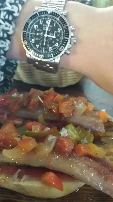 Que bellezas contrastadas :mi precioso zenith en la muñeca de mi igualmente preciosa mujer y de fondo unas tostas de lomo de sardina ahumada con verduritas pochadas y reducción de coñac y emulsión de soja...