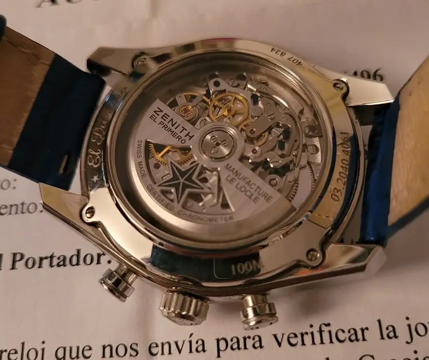 La caja original y documentación se perdieron, se vende con una caja de viaje original de Zenith impecable y un certificado de autenticidad de Zenith de un concesionario oficial.