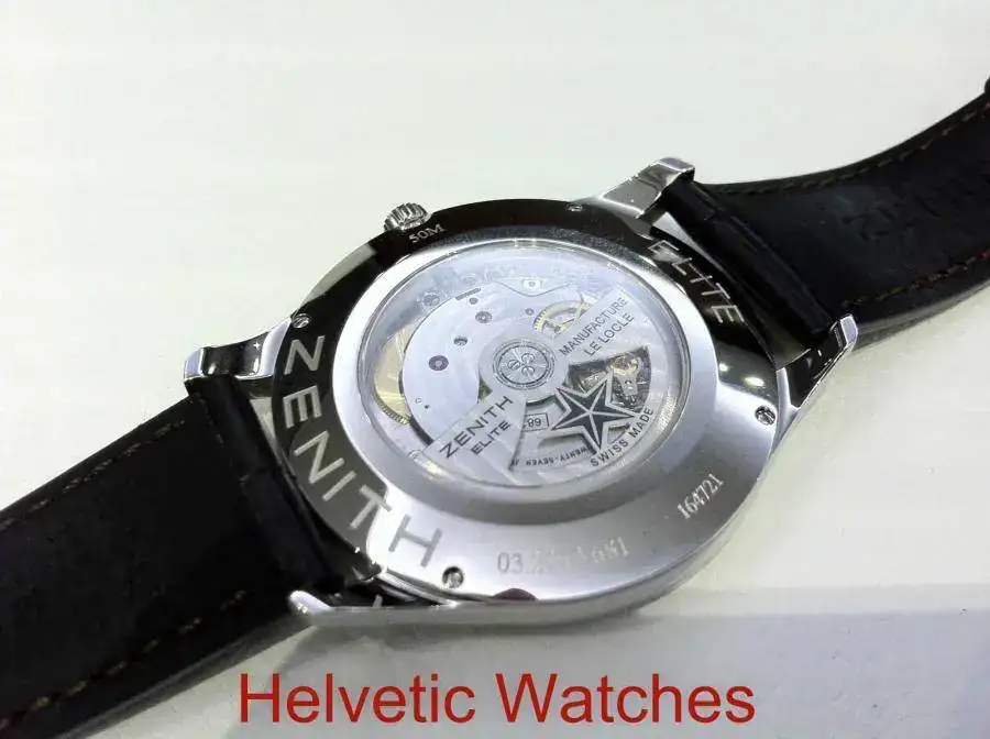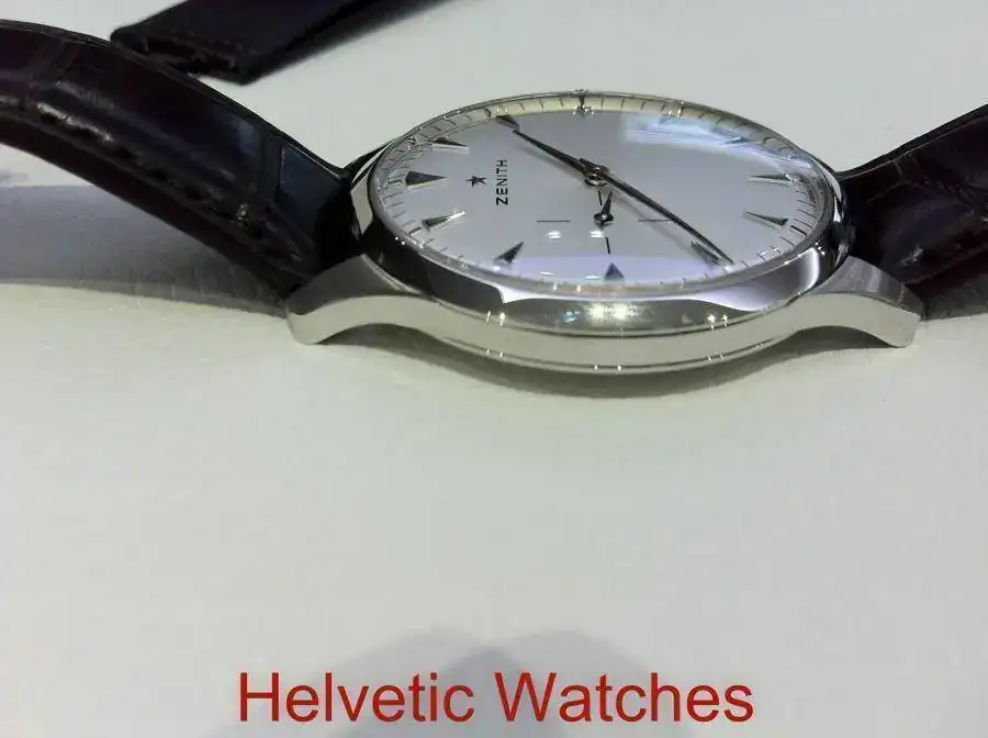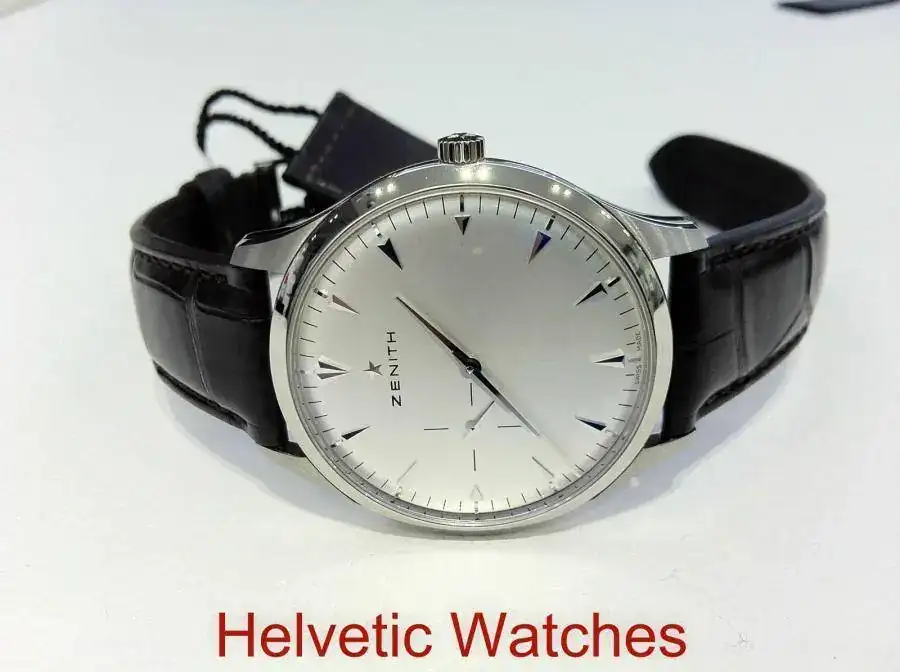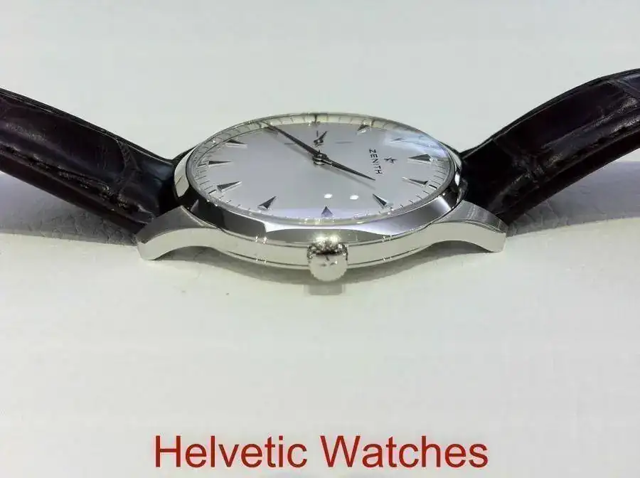 Precioso y elegante zenith extraplano, esfera plateada con efecto sunray y indices aplicados. Manufactura Zenith.