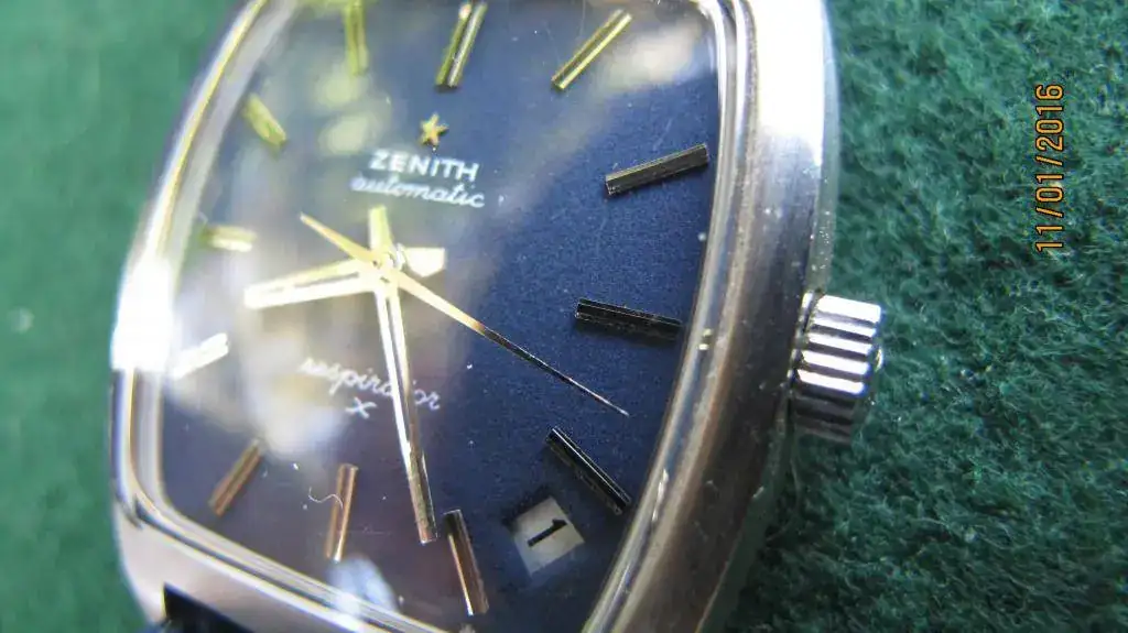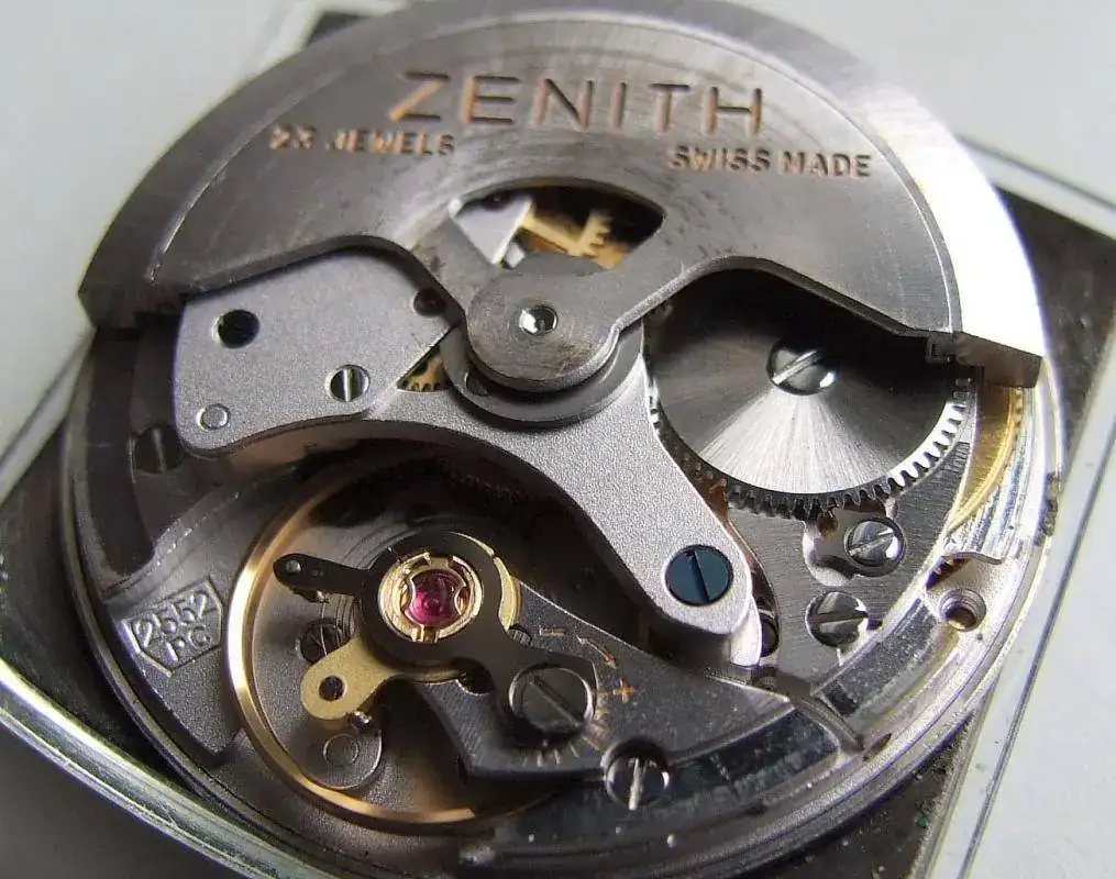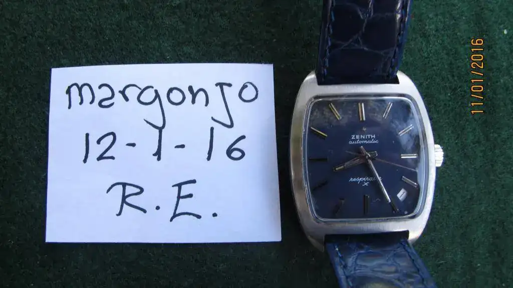 Lleva montada una maquinaria ZENITH calibre 2562PC, de 28.800 Ah, esfera azul intenso, fechador entre las 4-5 y corona personalizada