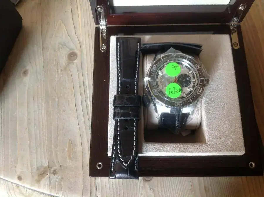 Como bien sabéis, esta pieza espectacular mide 45,5mm de caja y tiene un "raro" tamaño de 23 mm entre asas, por lo que en previsión de no encontrar correas de esa medida el maestro Jacobo me obsequió una vez màs con su buen hacer y creó la correa de croco con pespunte blanco de la foto preparada para el deplo original. Le favorece sobre todo porque la original, que está nueva, es muy plana y la de Jacobo es alomada, lo que sin duda le va a aumentar su incomparable prestancia. La correa por supuesto la regalo, nunca se ha puesto ni en el deplo.